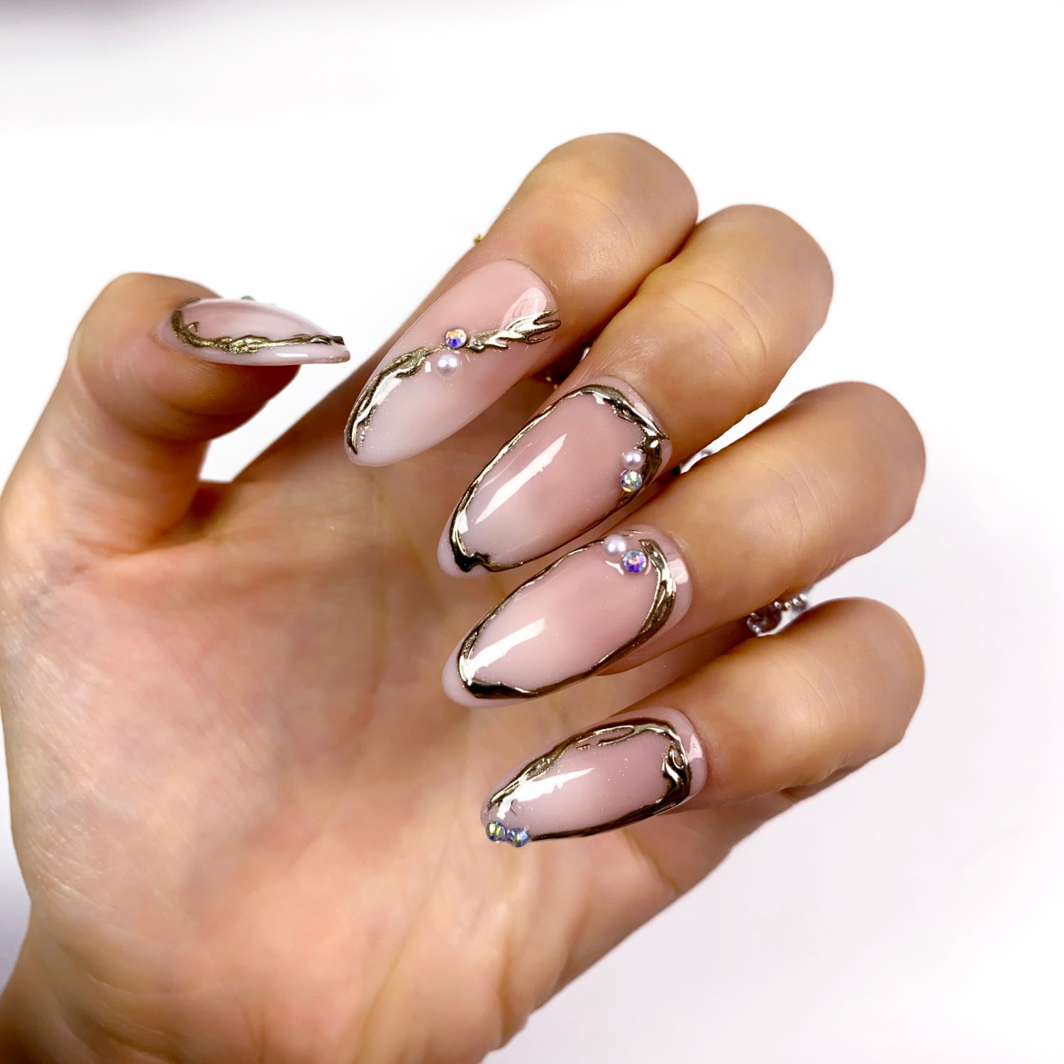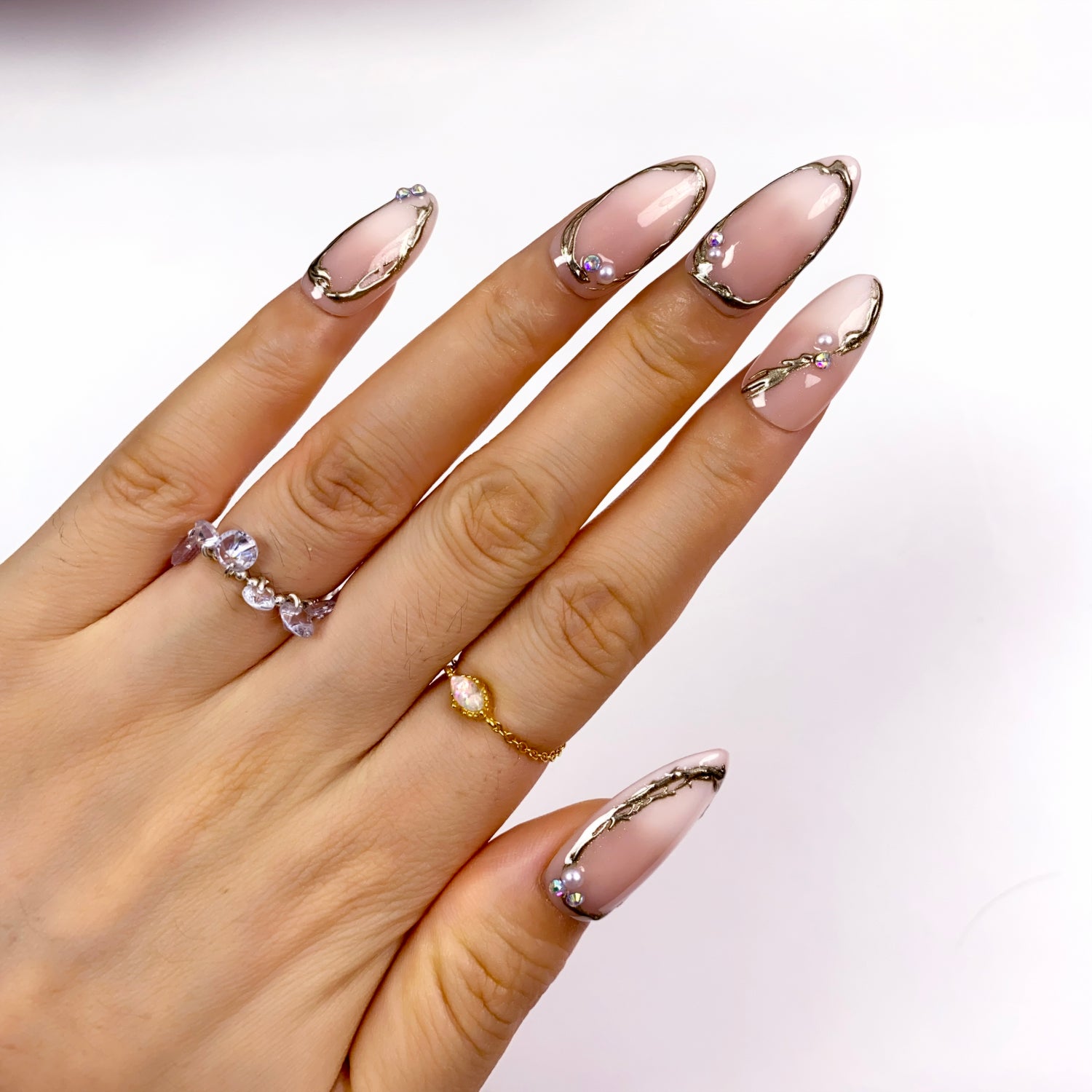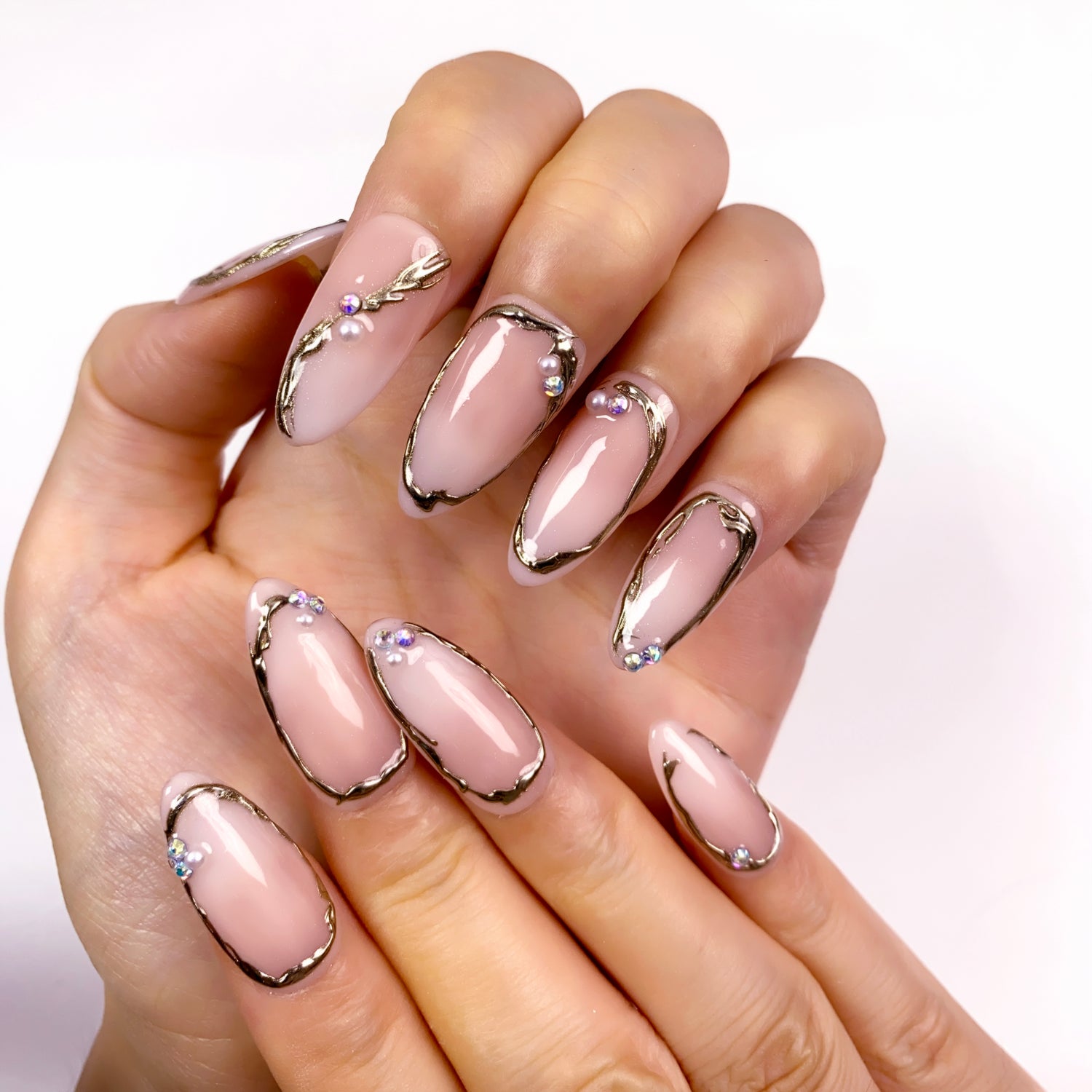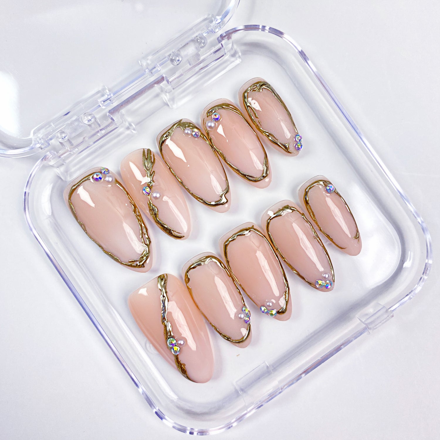 Blush Frame offers a soft gradient from white to pink, framed by delicate gold metal lines and dazzling rhinestones. This elegant press-on set balances subtle romance with a touch of sparkle. The handcrafted gradient base gives it a luminous glow — ideal for soft glam or graceful transitions from day to night.
