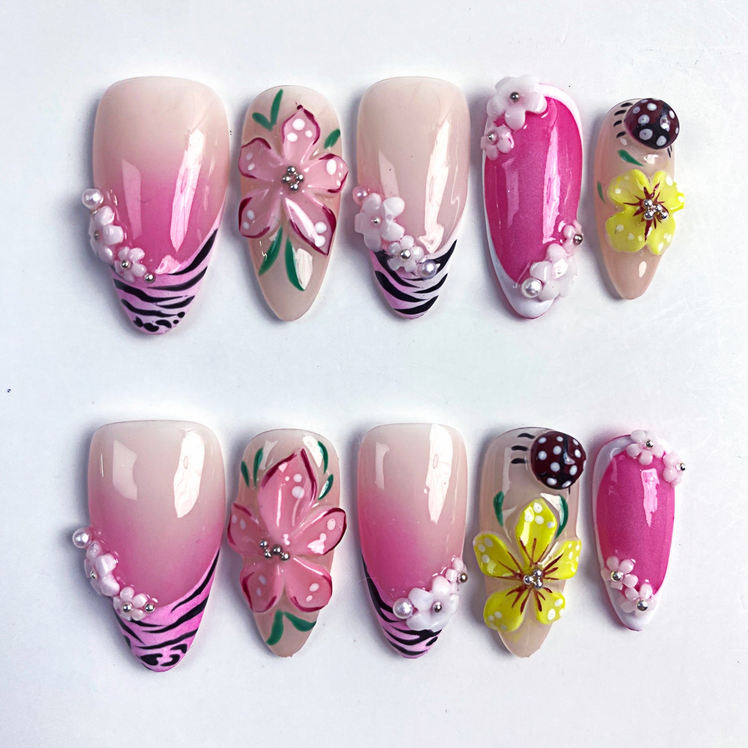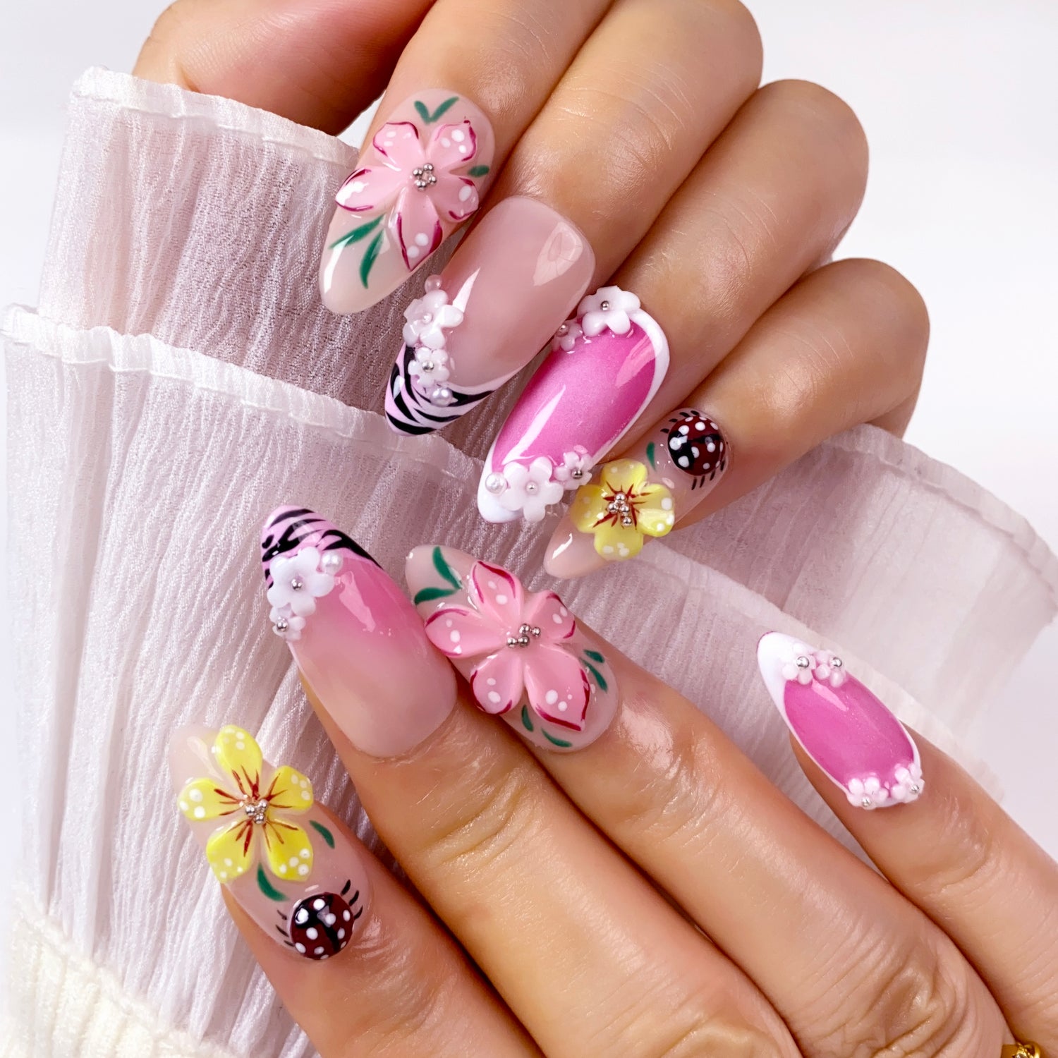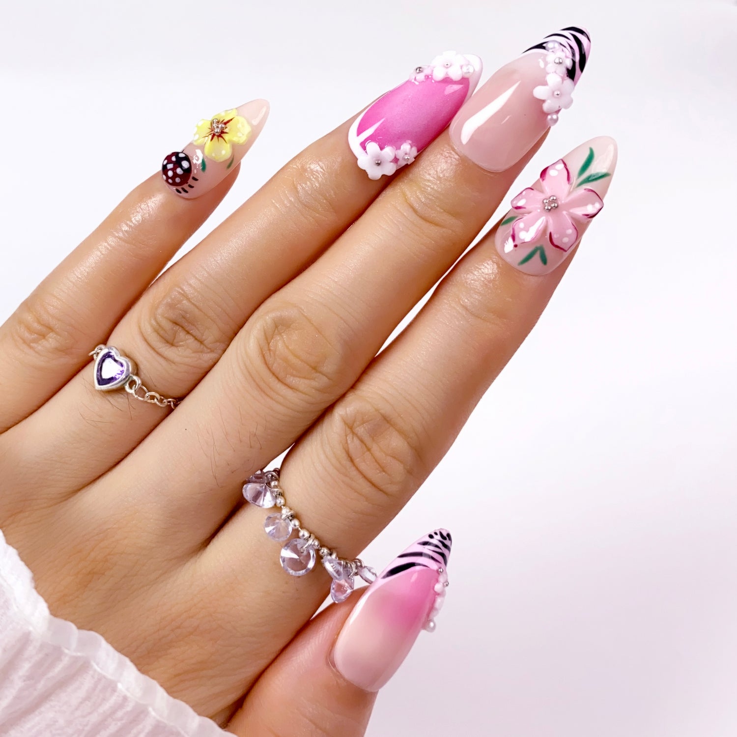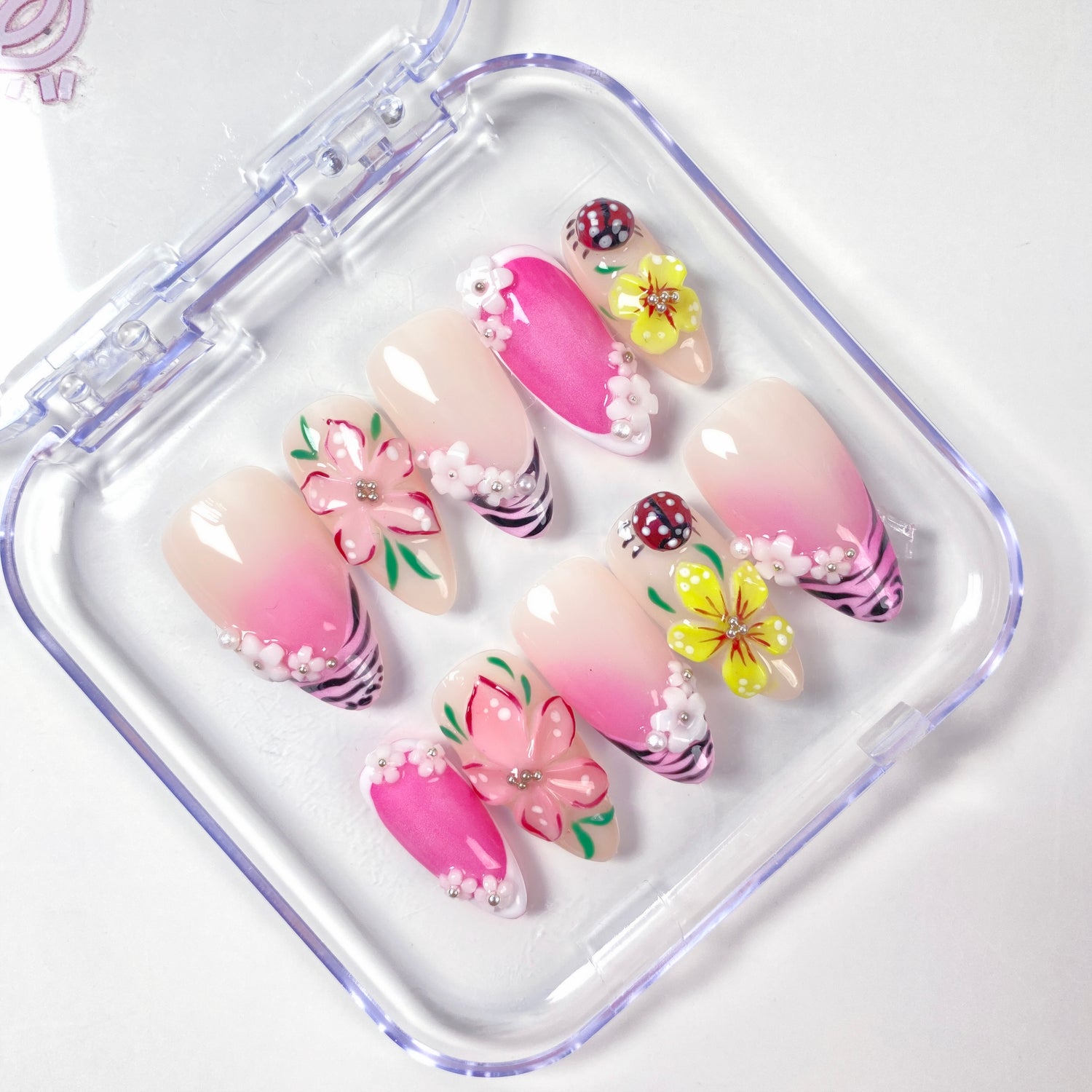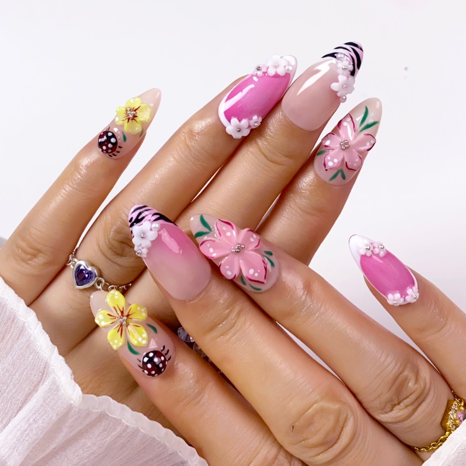 Step into a whimsical garden with Ladybug Bloom press-on nails from Glowyshe. Featuring a soft nude base and pastel floral accents, this enchanting set comes to life with 3D daisies and a charming red ladybug centerpiece. The medium almond shape adds elegance, while delicate green details evoke fresh springtime vibes.