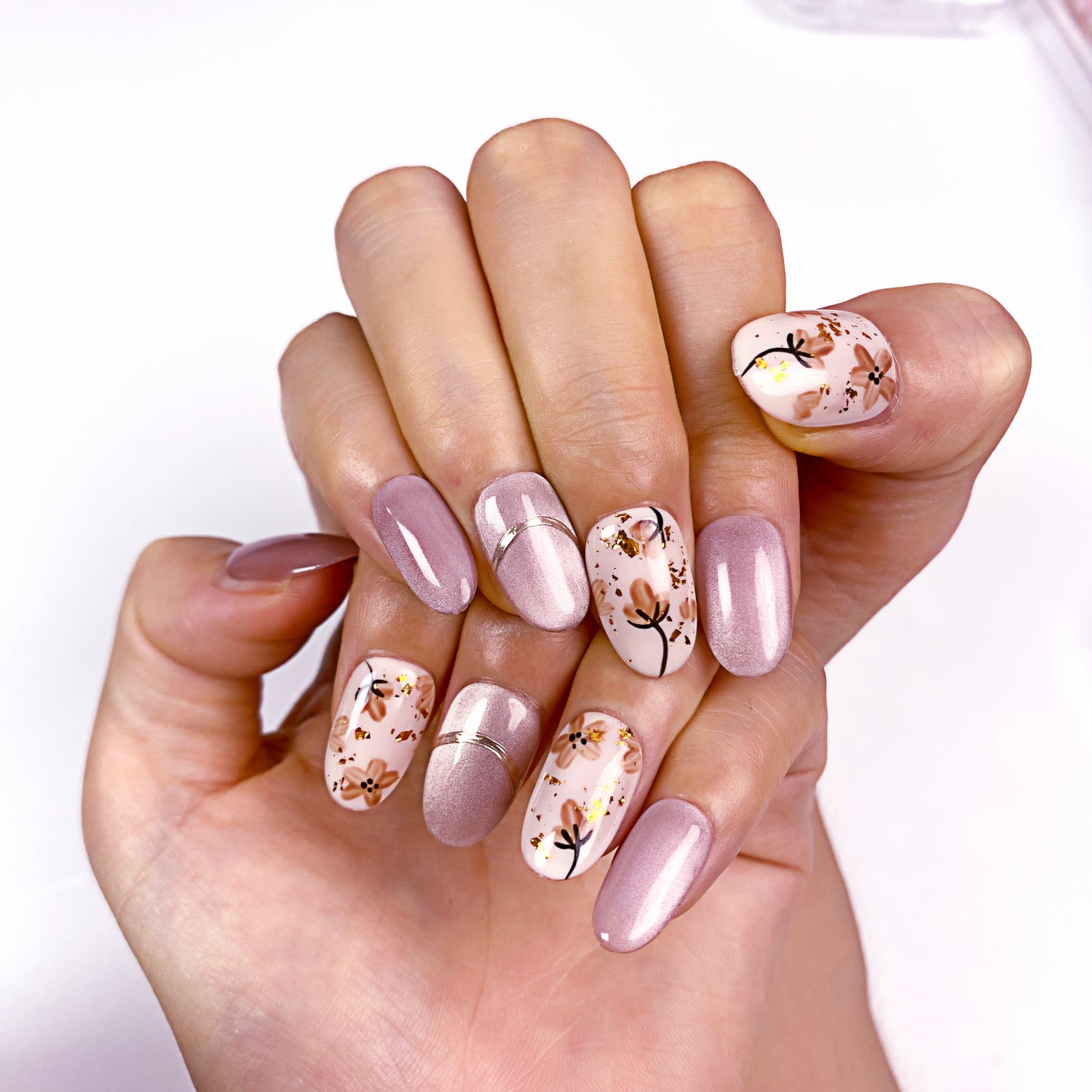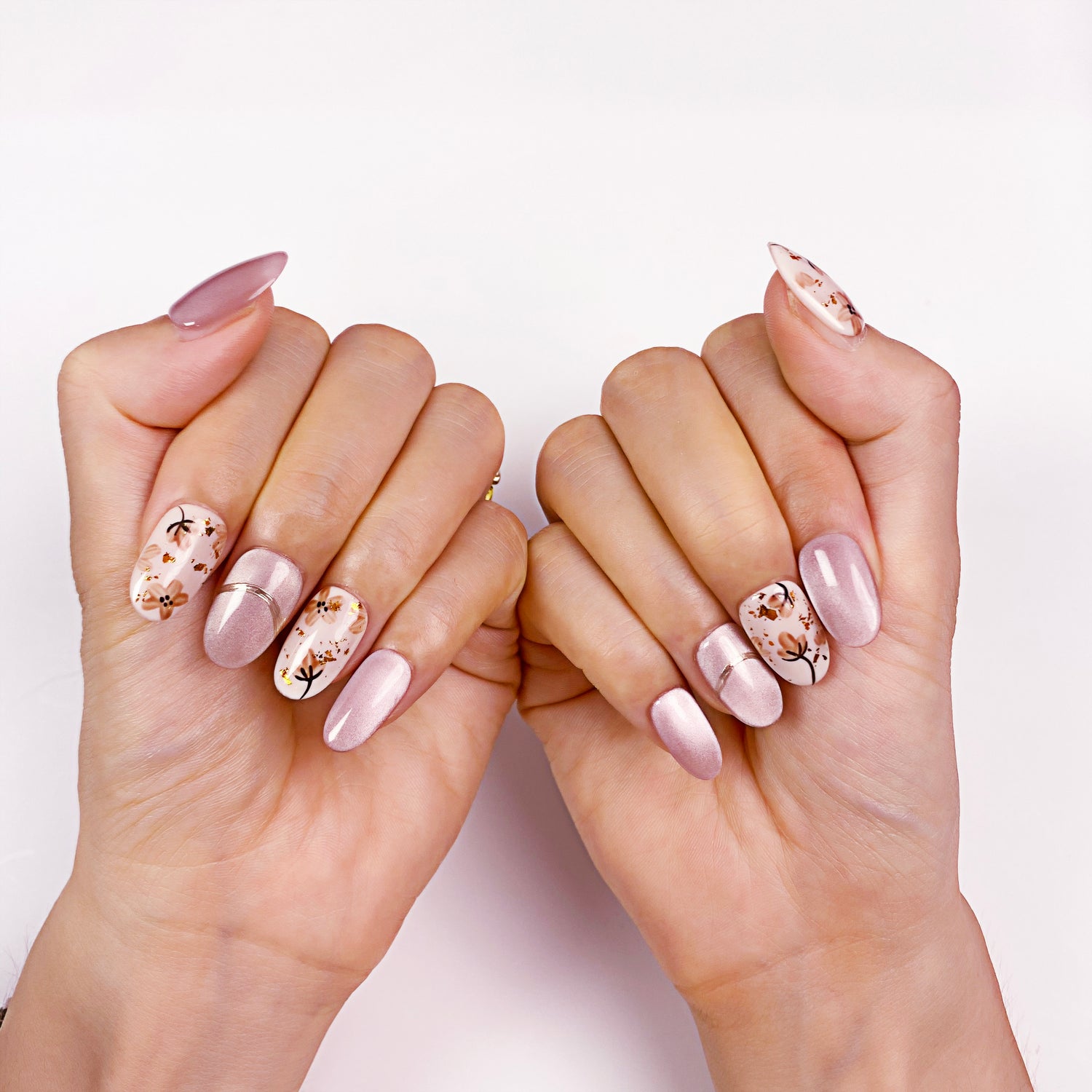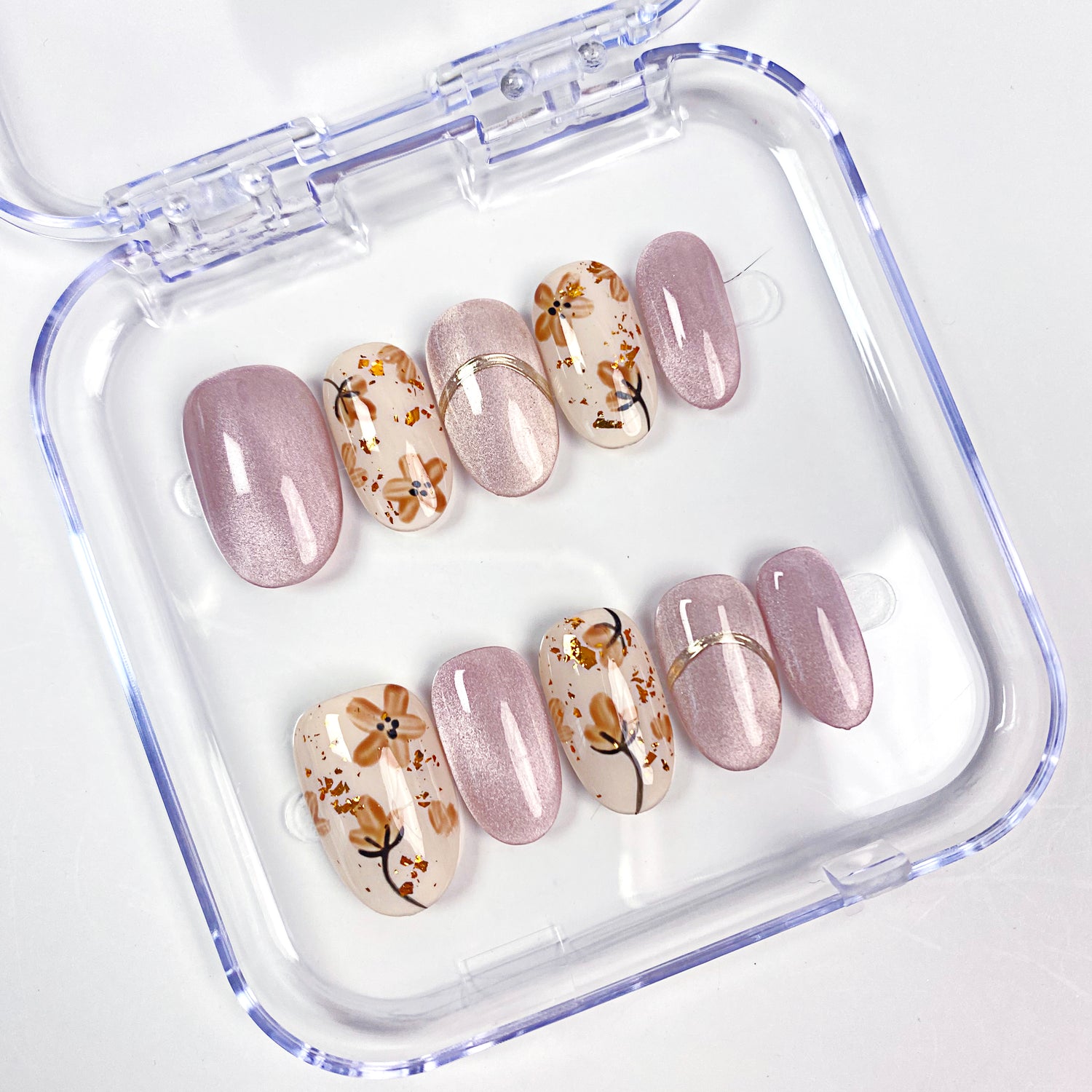 Embrace the soft allure of Rosy Gleam press-on nails from Ersa Nails. Featuring a delicate pink cat-eye shimmer with a mirror-like sheen, this design is enhanced by hand-painted floral details for a romantic finish. Perfect for adding elegance and subtle sparkle to any look.