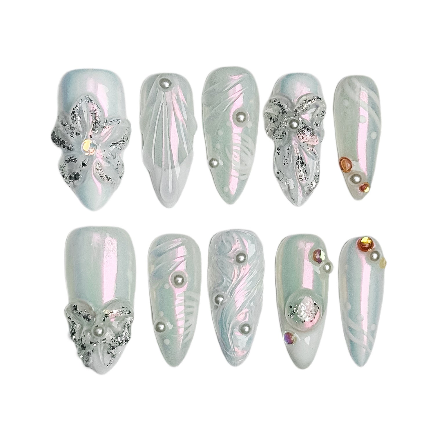 Dive into shimmering elegance with Silver Wave press-on nails from Glowyshe. Featuring metallic silver tones, 3D floral accents, and subtle wave patterns, this design radiates modern sophistication. The medium almond shape adds a polished, chic finish, perfect for parties, special occasions, or elevating your everyday style.