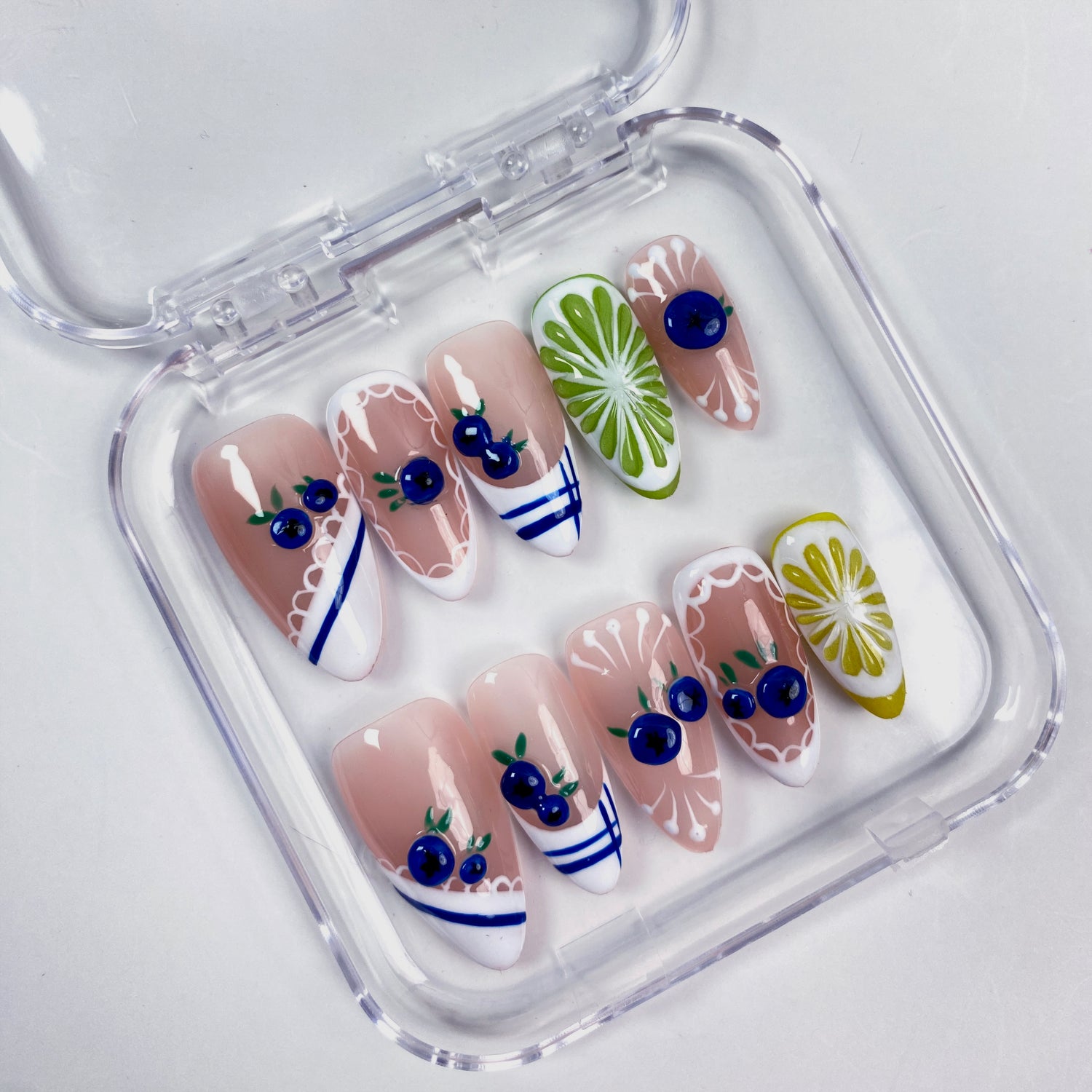 Sweet and playful, Lace Citrus combines hand-painted blueberry tones, delicate lace textures, and dimensional lemon details for a refreshingly unique set. The soft pastel base adds a dreamy foundation, while intricate artwork delivers personality. Ideal for spring and summer moments that need a pop of charm.