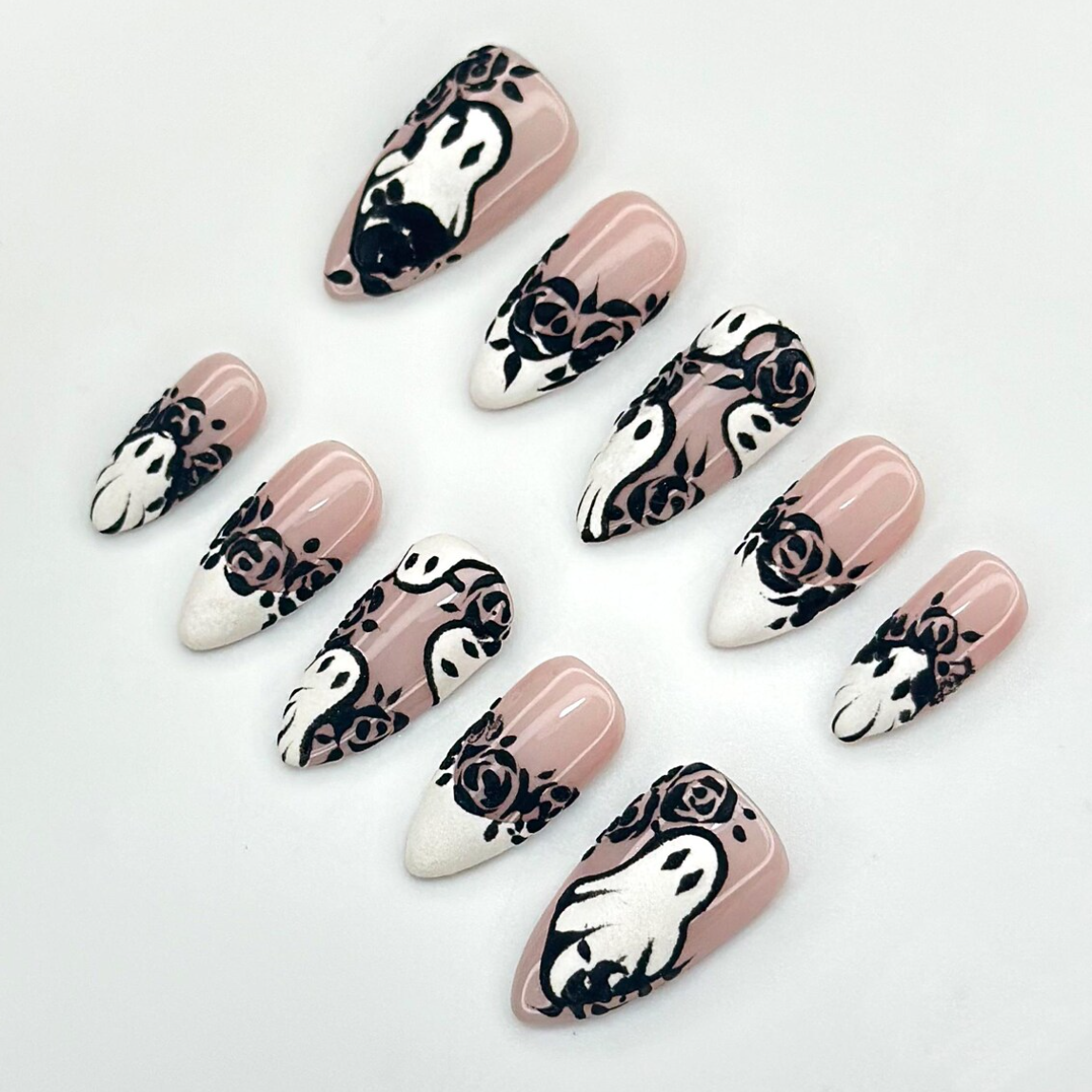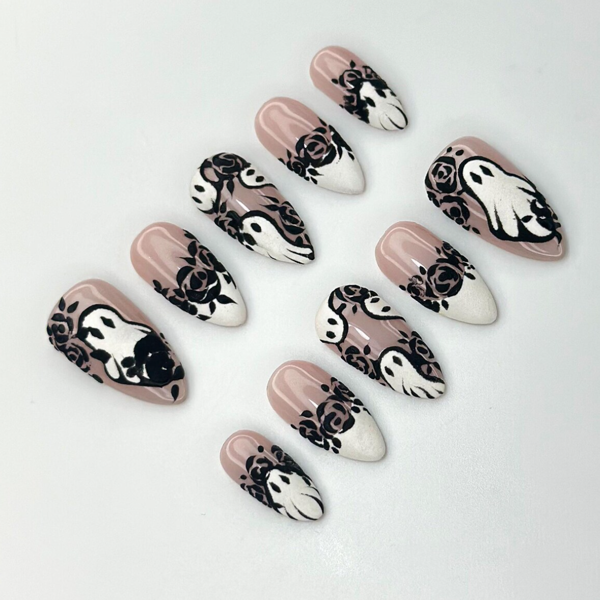 Step into spooky elegance with Haunted Rose press on nails. Featuring gothic black floral patterns, ghost accents, and nude-white tones, this handmade Halloween nail art set blends scary and chic. Easy to apply, reusable, and durable like acrylic nails—perfect for haunted parties, gothic nails, and seasonal Halloween fashion.