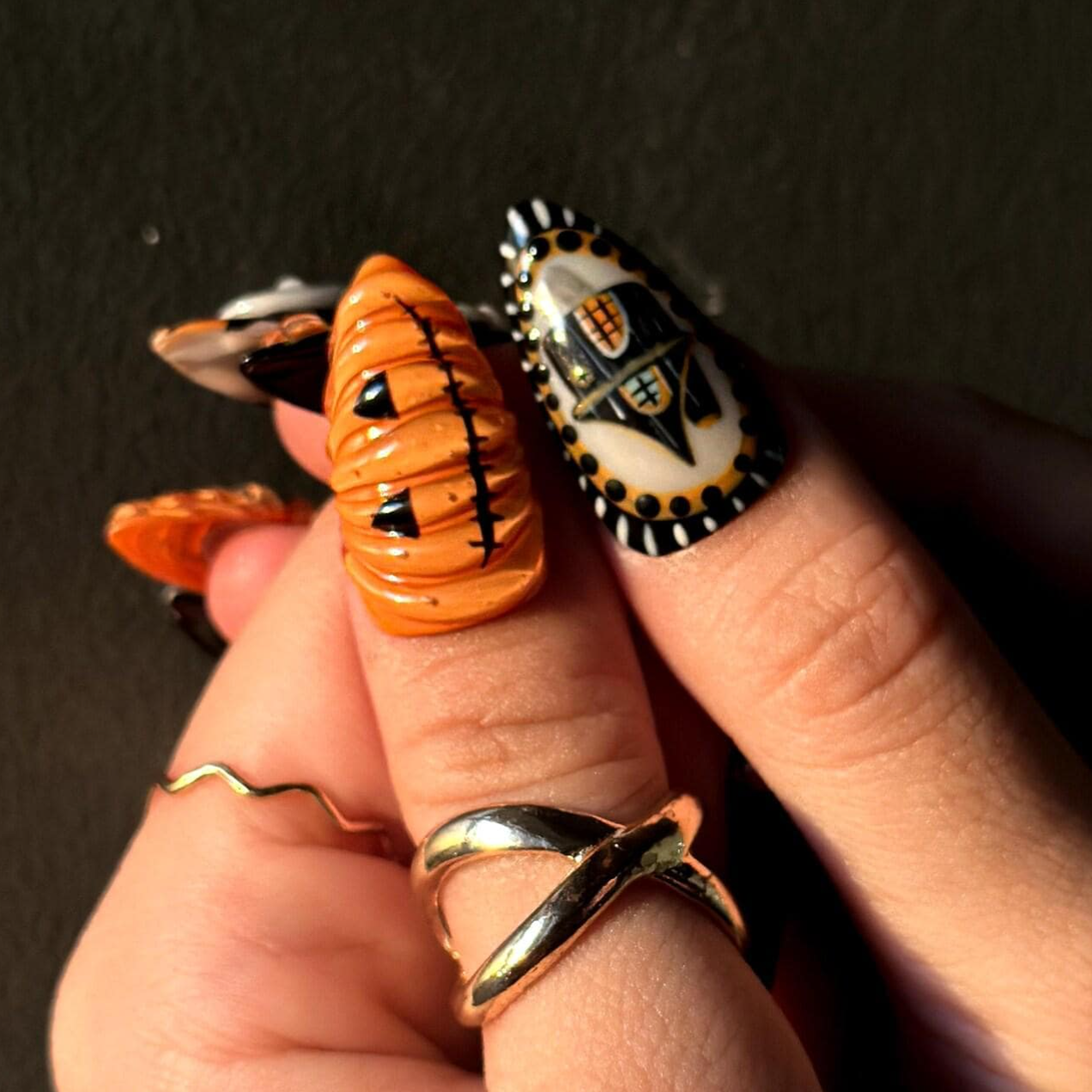Celebrate the season with these pumpkin Halloween press on nails. Featuring handmade 3D ghost and pumpkin designs with a haunted house vibe, this festive nail art set is perfect for October nights. Easy to apply and reusable, these spooky Halloween press on nails deliver long-lasting, salon-style fun for your manicure.