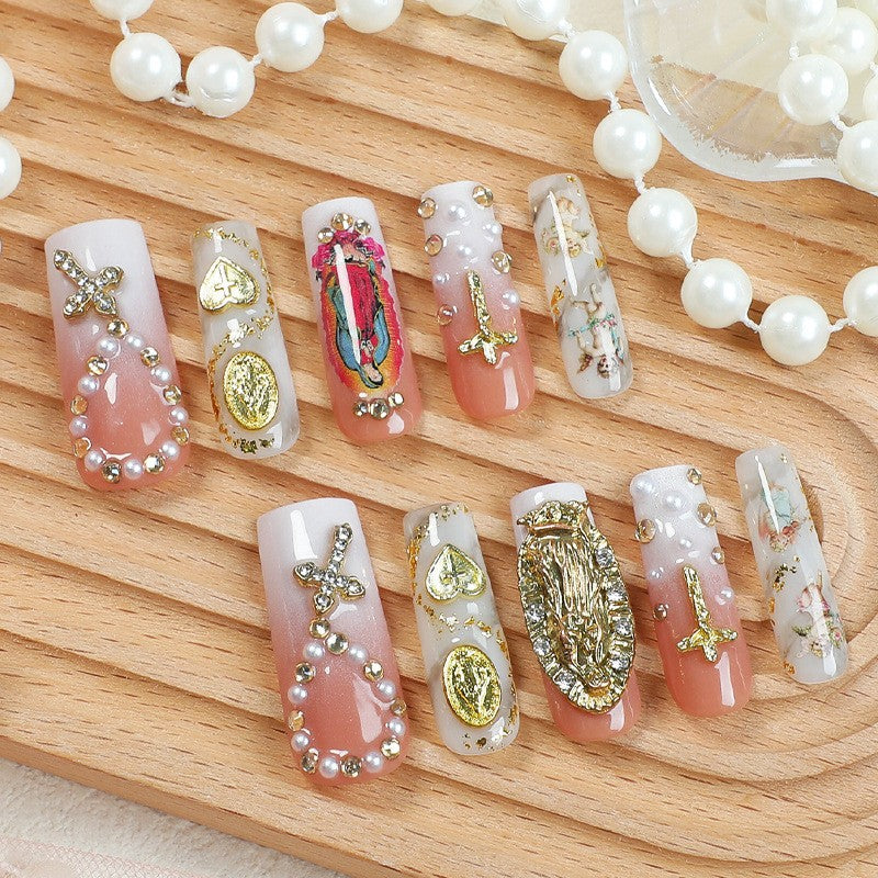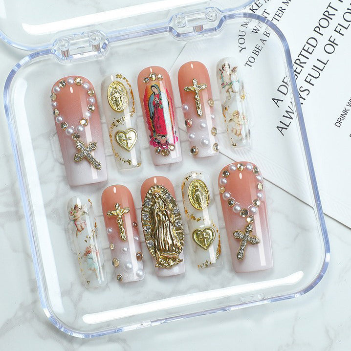 Express love and faith with Heart Cross press-on nails from Glowyshe. Featuring intricate 3D cross designs adorned with sparkling rhinestone hearts, this elegant set combines delicate craftsmanship with heartfelt symbolism. Perfect for adding a romantic and meaningful touch to your look.