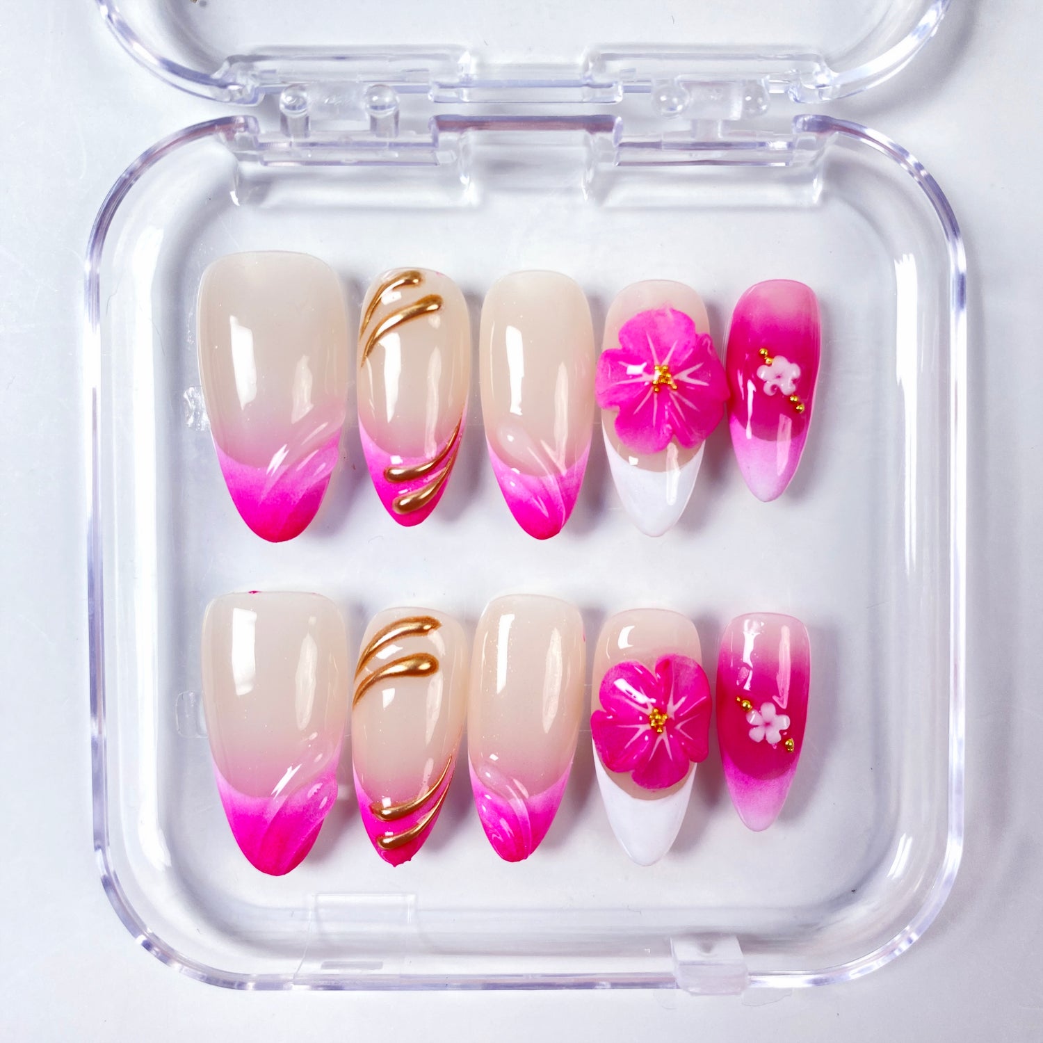 Unveil your romantic side with Rosé Petal press-on nails. With a chic French tip base and rich magenta hues, this design is adorned with elegant 3D floral embellishments. The perfect blend of bold femininity and timeless elegance, it’s an ideal look for date nights or special moments.