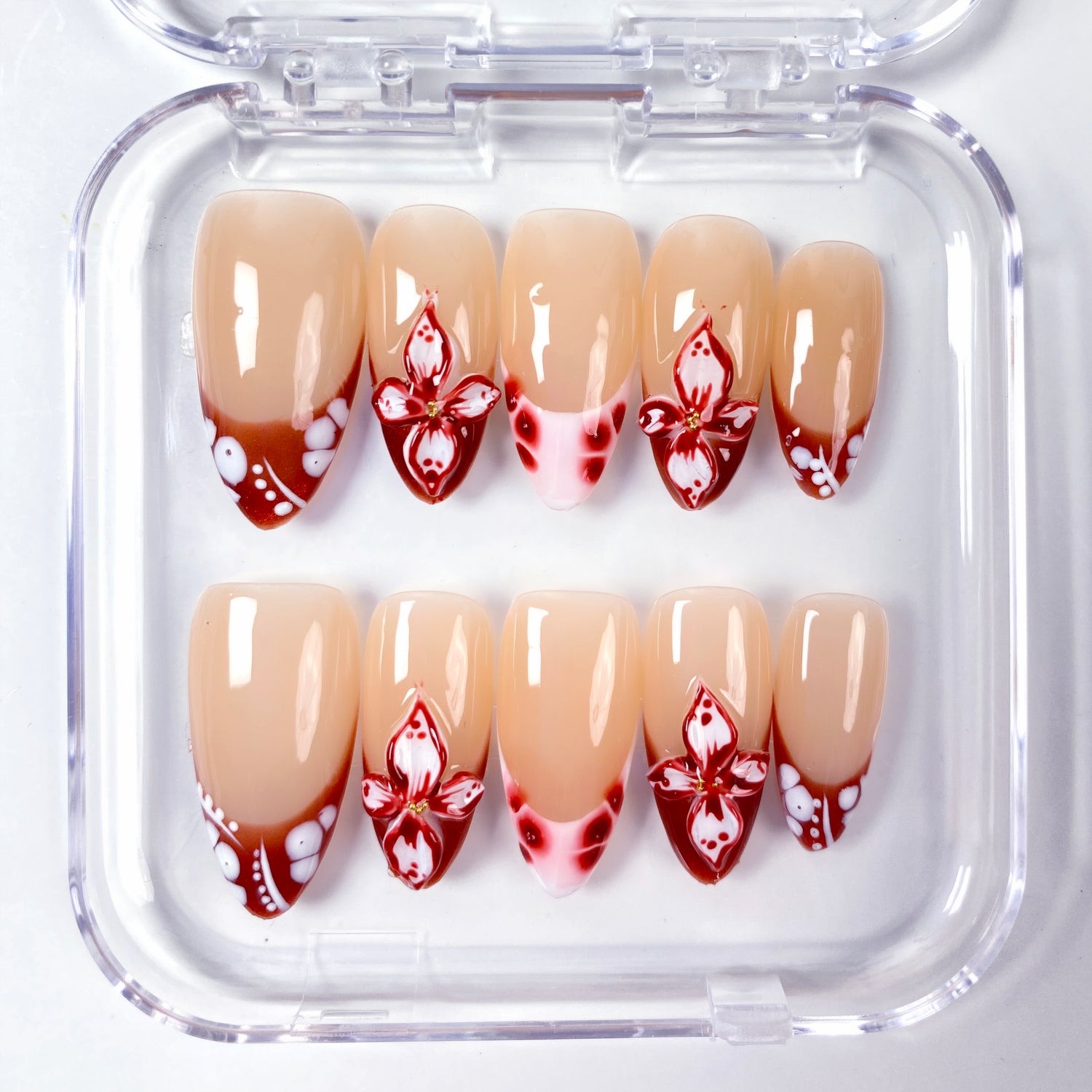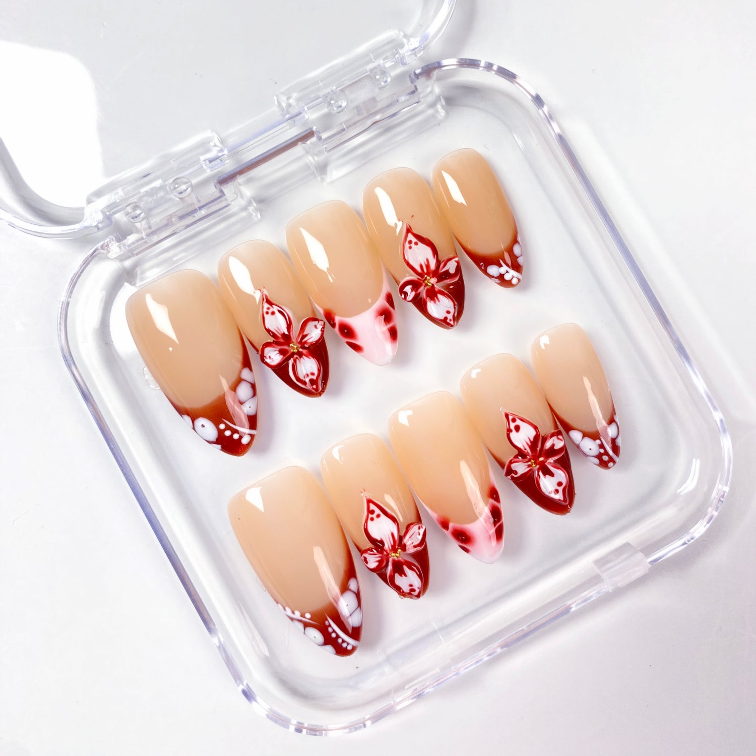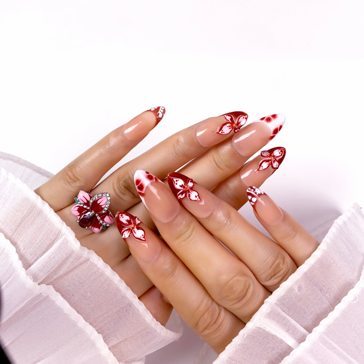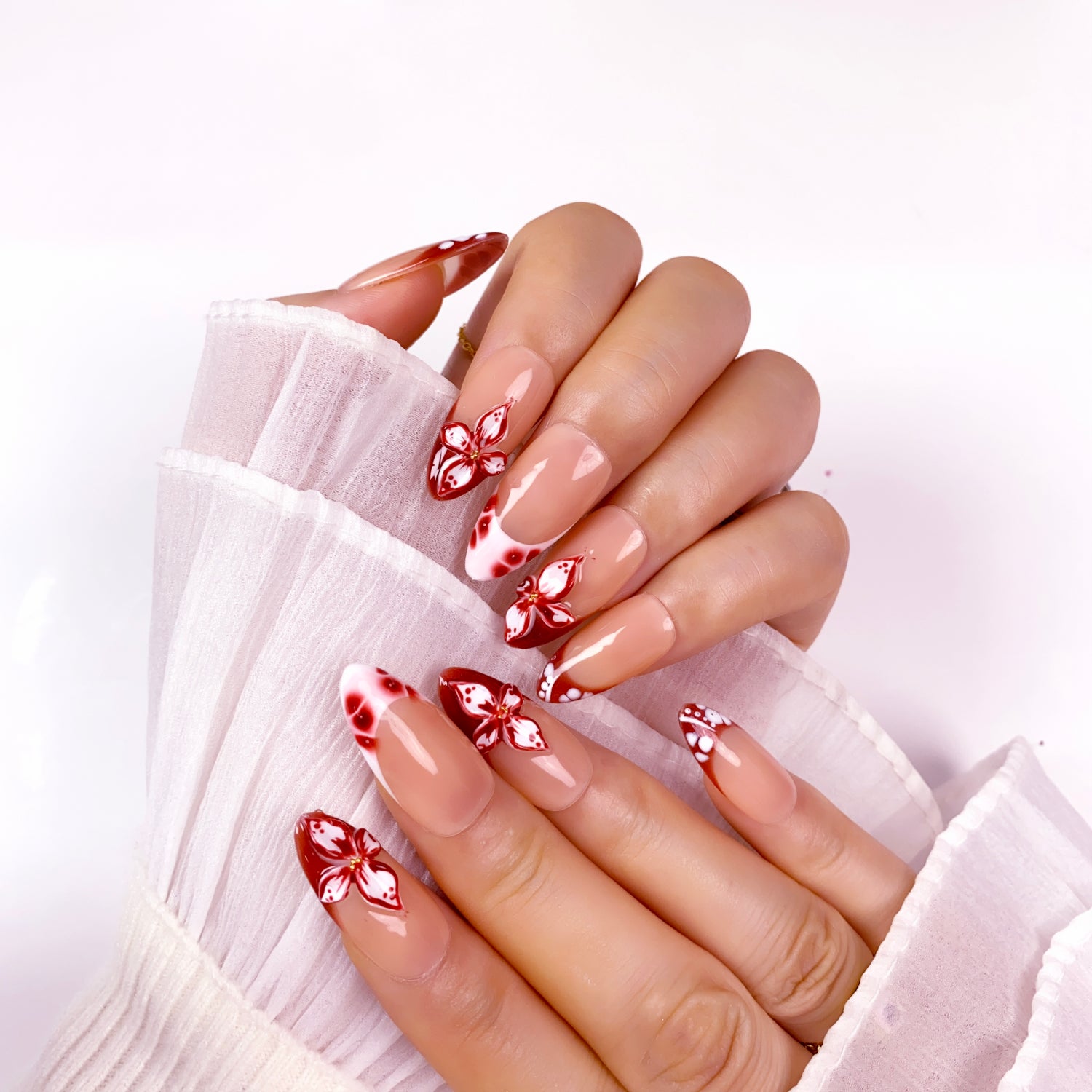 Experience the romantic allure of Scarlet Garden press-on nails. Designed with a soft nude base and vibrant French red tips, each nail blooms with stunning 3D red flowers. This look effortlessly blends timeless elegance with artistic flair—ideal for adding passion and sophistication to any occasion.
