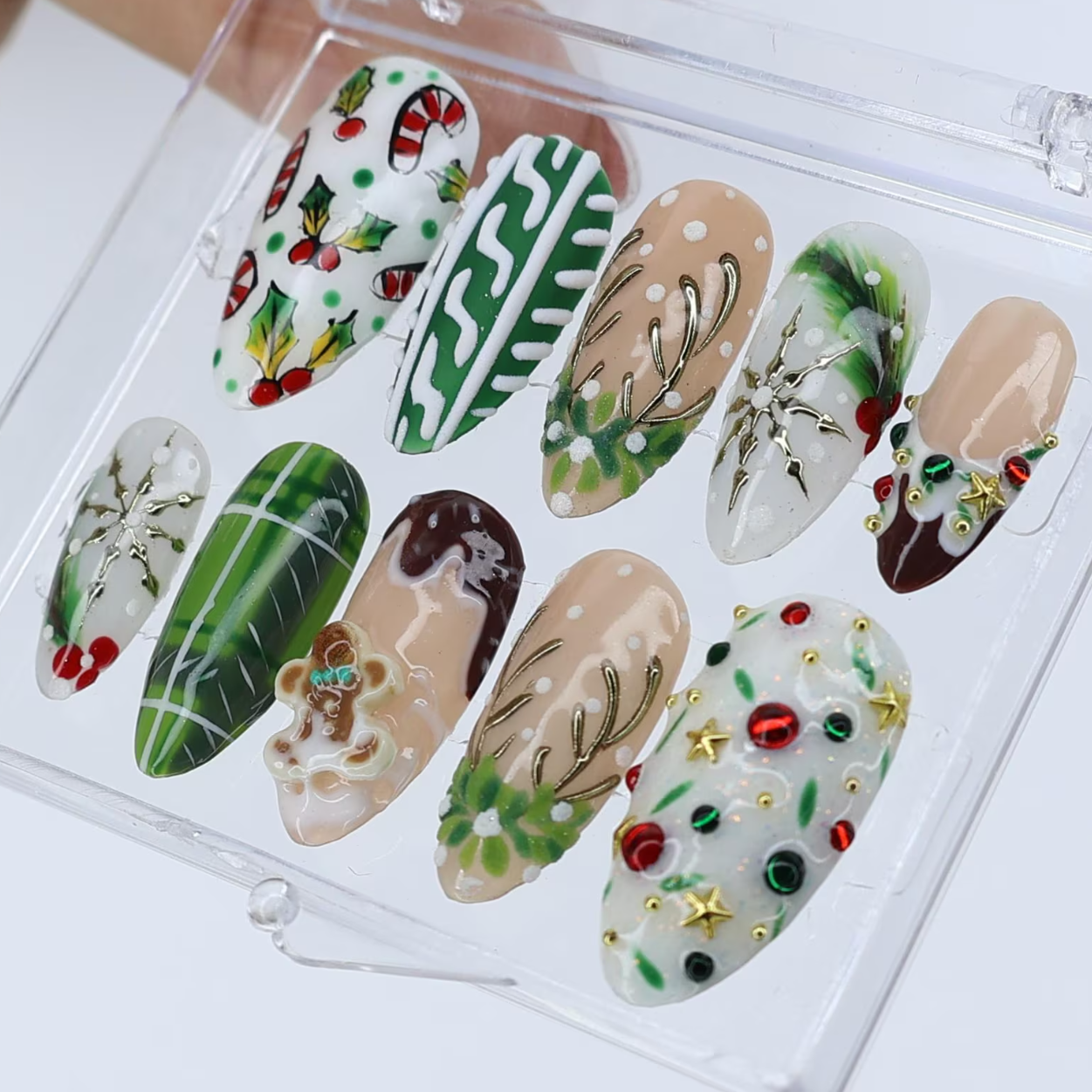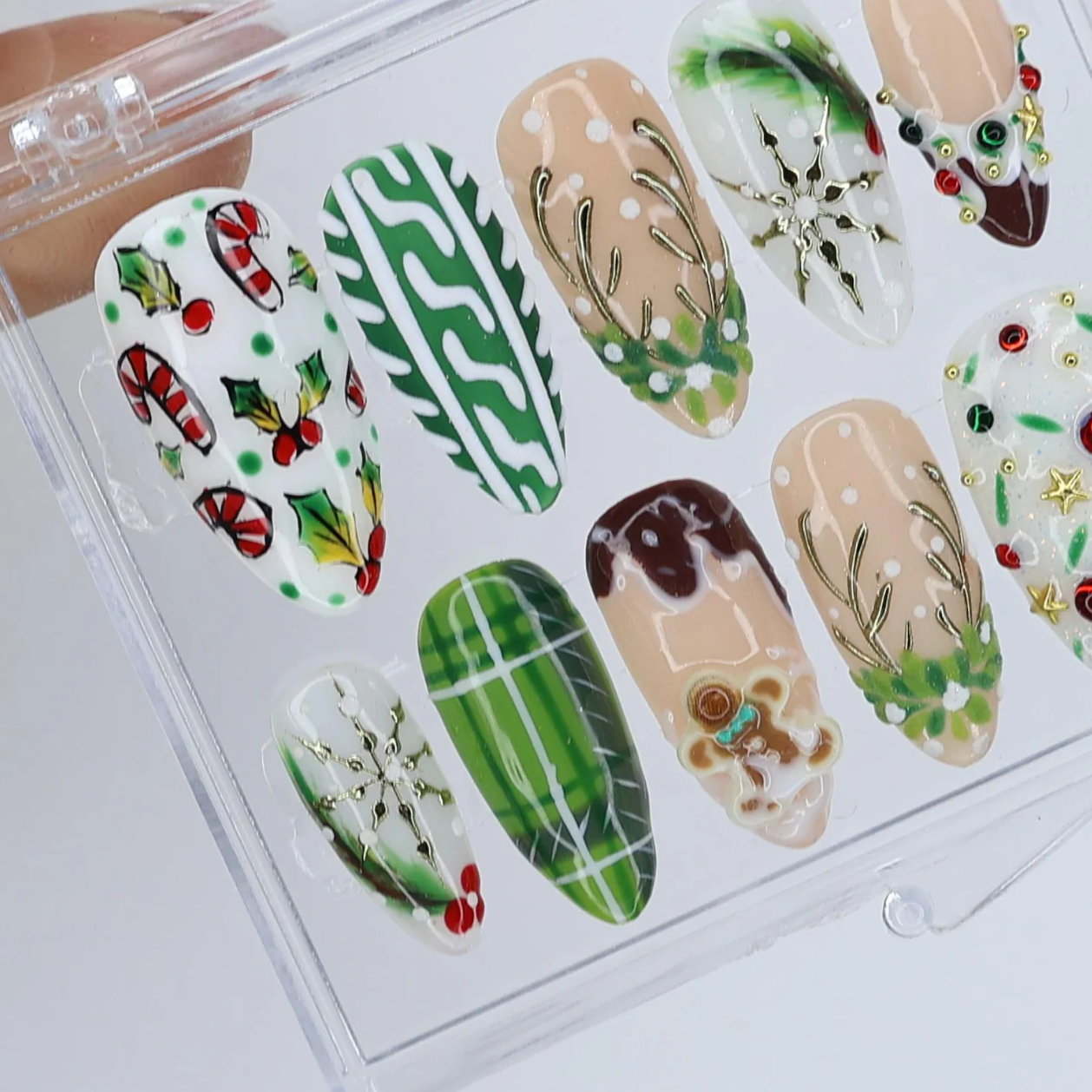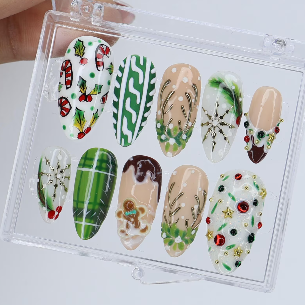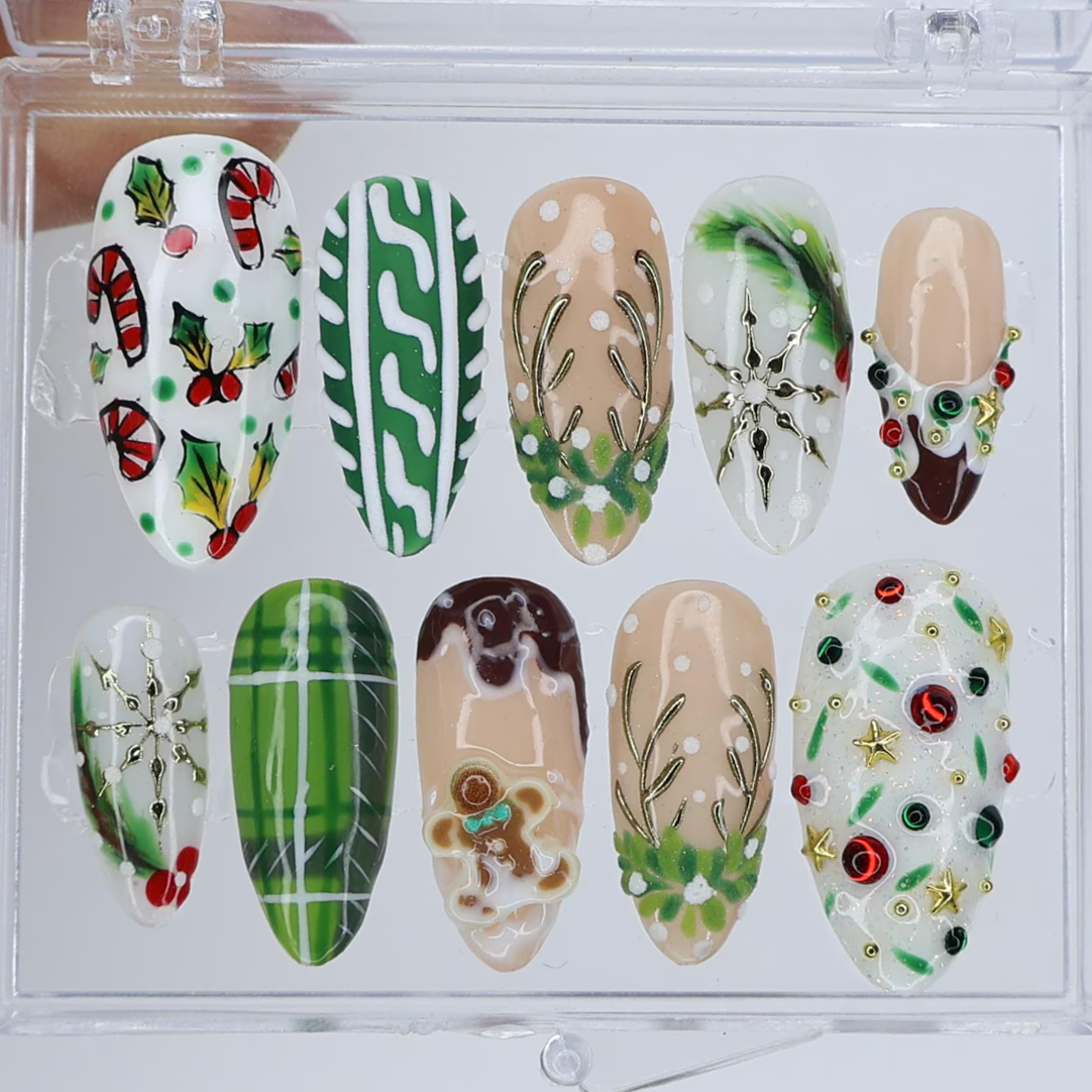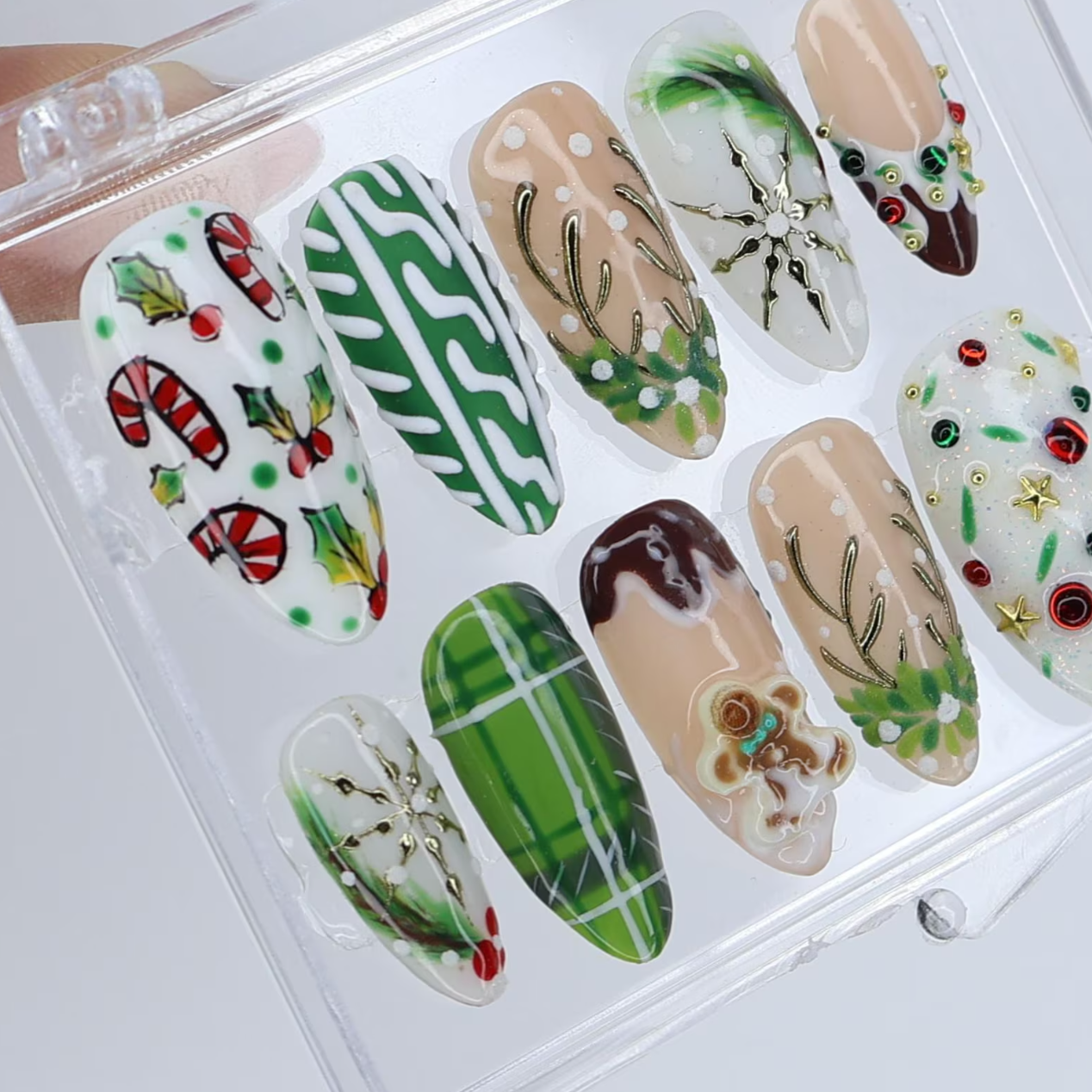 Sweeten your holiday style with our Candy Cane Christmas Press-On Nails! đ Featuring holly, gingerbread, and red-white patterns, these handmade medium almond nails capture the joy of Christmas. Easy to apply, long-lasting, and perfect for festive nail art or a cozy winter look.