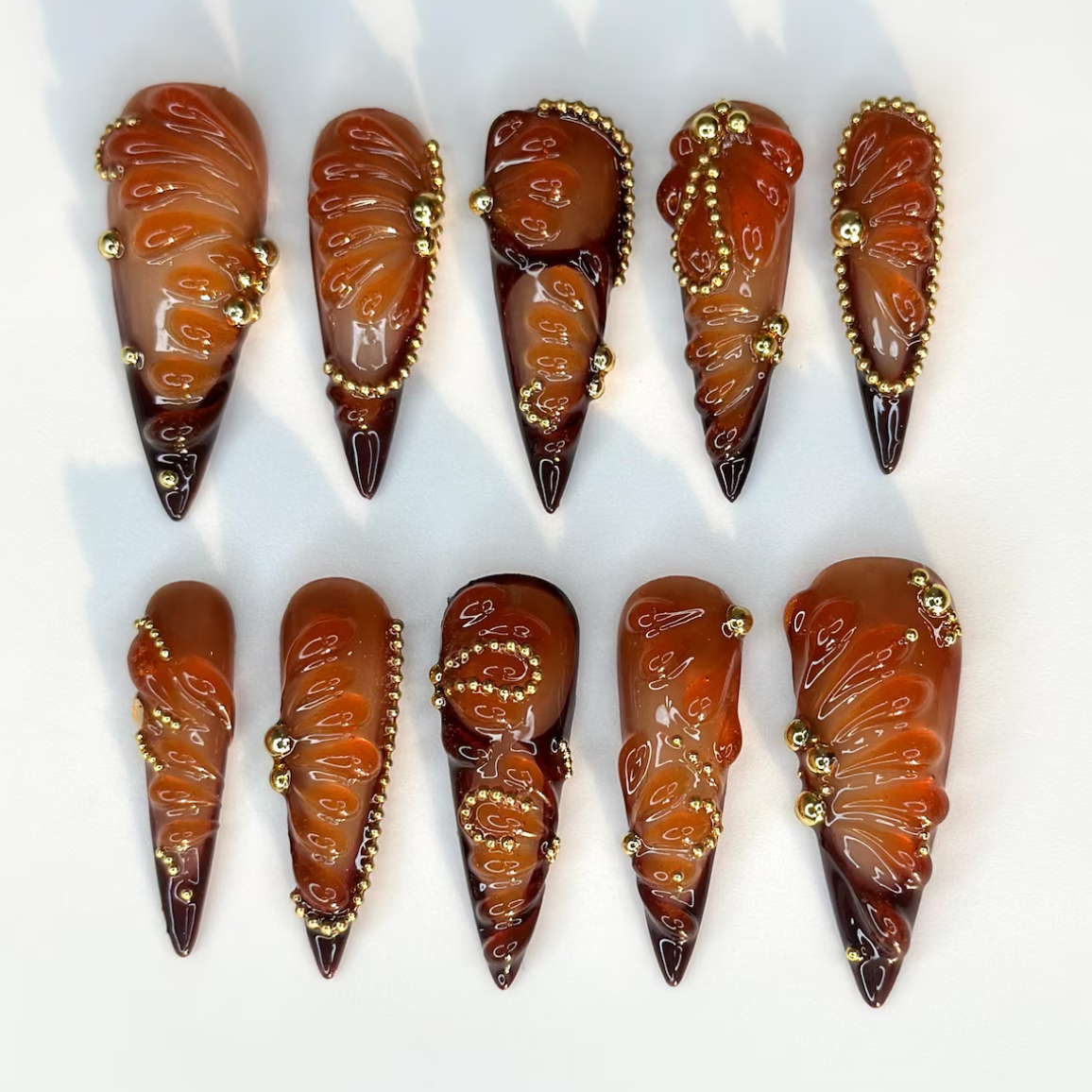 Step into autumn elegance with Amber Glam long stiletto press on nails. Featuring a stunning brown and gold ombre with 3D swirl nail art, this luxury handmade set is perfect for fall outfits, parties, or everyday glam. Durable, reusable, and easy to apply, these elegant press on nails bring warm amber vibes to your manicure.