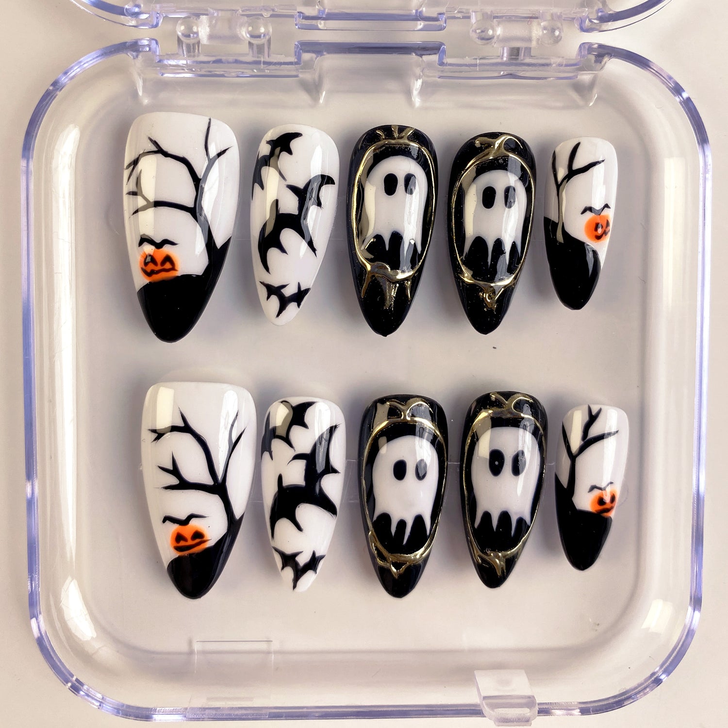 Shine this spooky season with Bat Ghost handmade press-on nails. Featuring hand-painted ghosts, bats, and metallic gold accents, these Halloween nails deliver a chilling yet glamorous vibe. Easy to apply, reusable, and durable, they’re perfect for costume parties, trick-or-treat nights, or adding a spooky glam look to your October style.