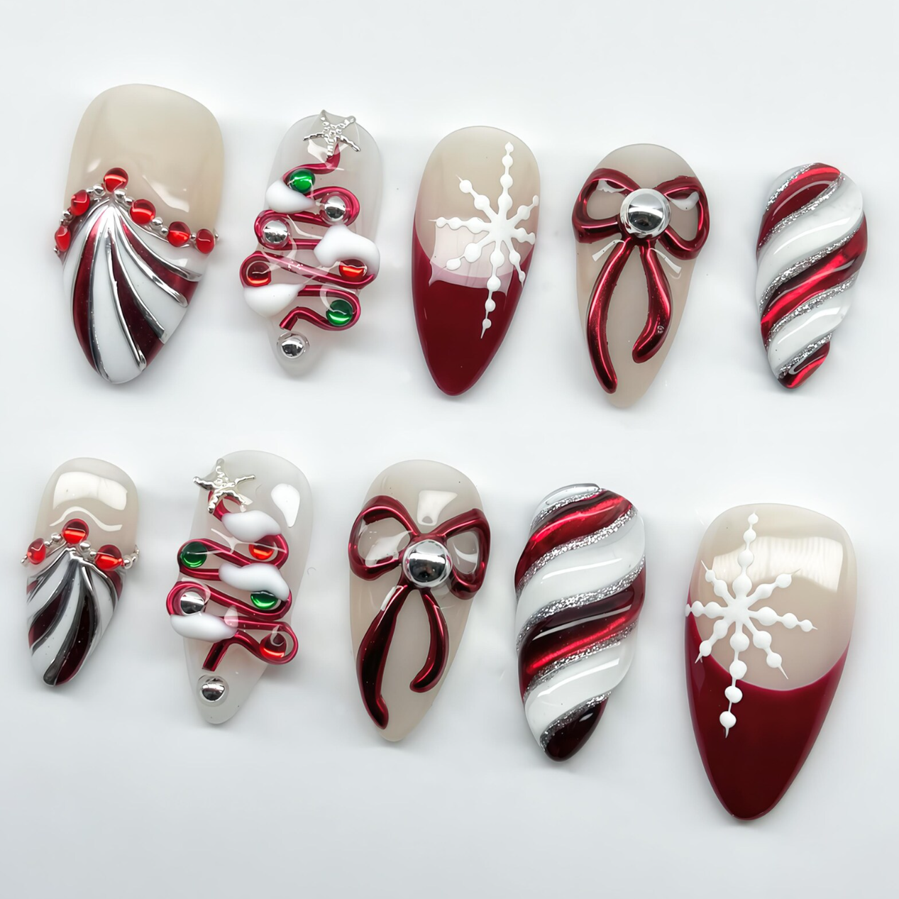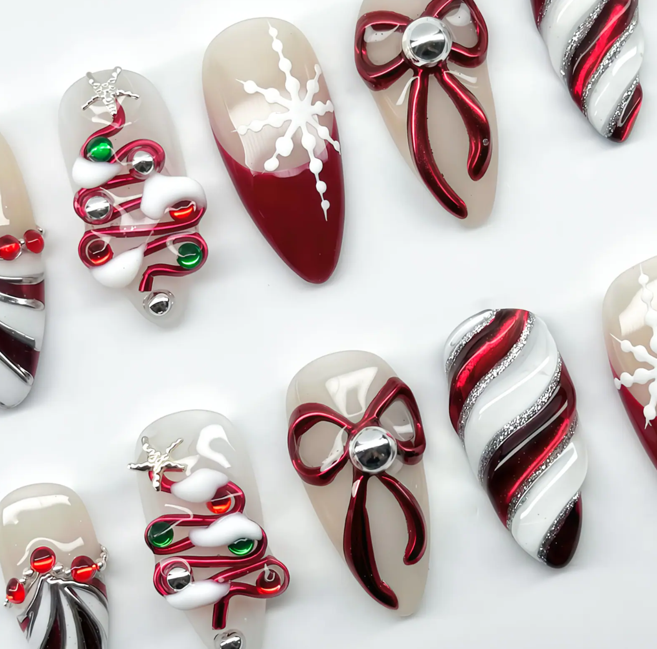 Add festive cheer with these red and white Christmas press on nails featuring 3D bow, candy cane, and snowflake designs. Ideal for holiday parties or winter nail art lovers, these handmade reusable nails offer a sweet and stylish Christmas nail look that captures the magic of the season with every sparkle.