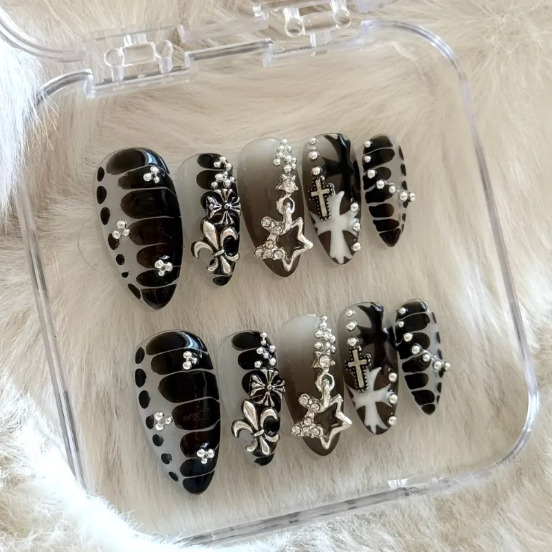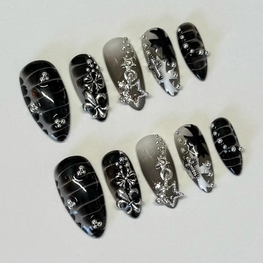 Unleash your edge with Chrome Star Nails. This gothic black chrome press-on nail set is decorated with 3D star charms, rhinestones, and cross-inspired details. Perfect for trendy hot girl nails, dark punk nail designs, or edgy gothic nails, these fake nails add a bold statement to your fashion look instantly.
