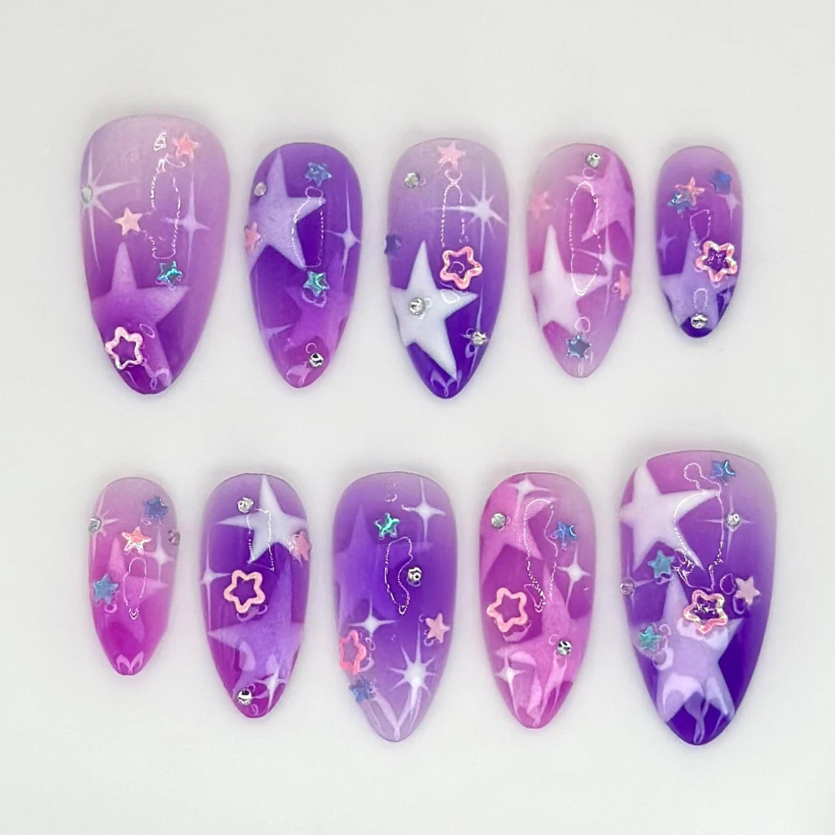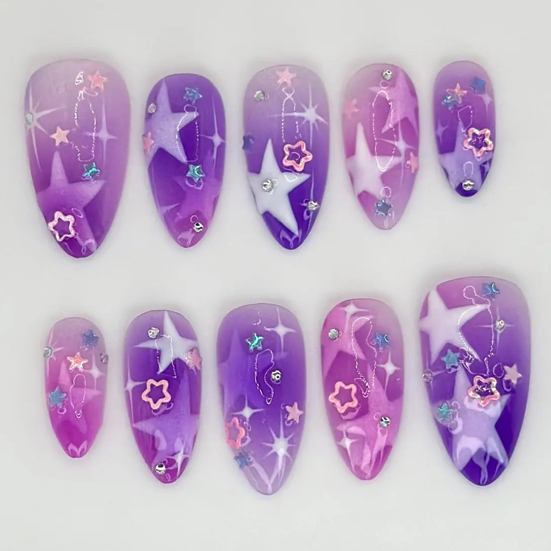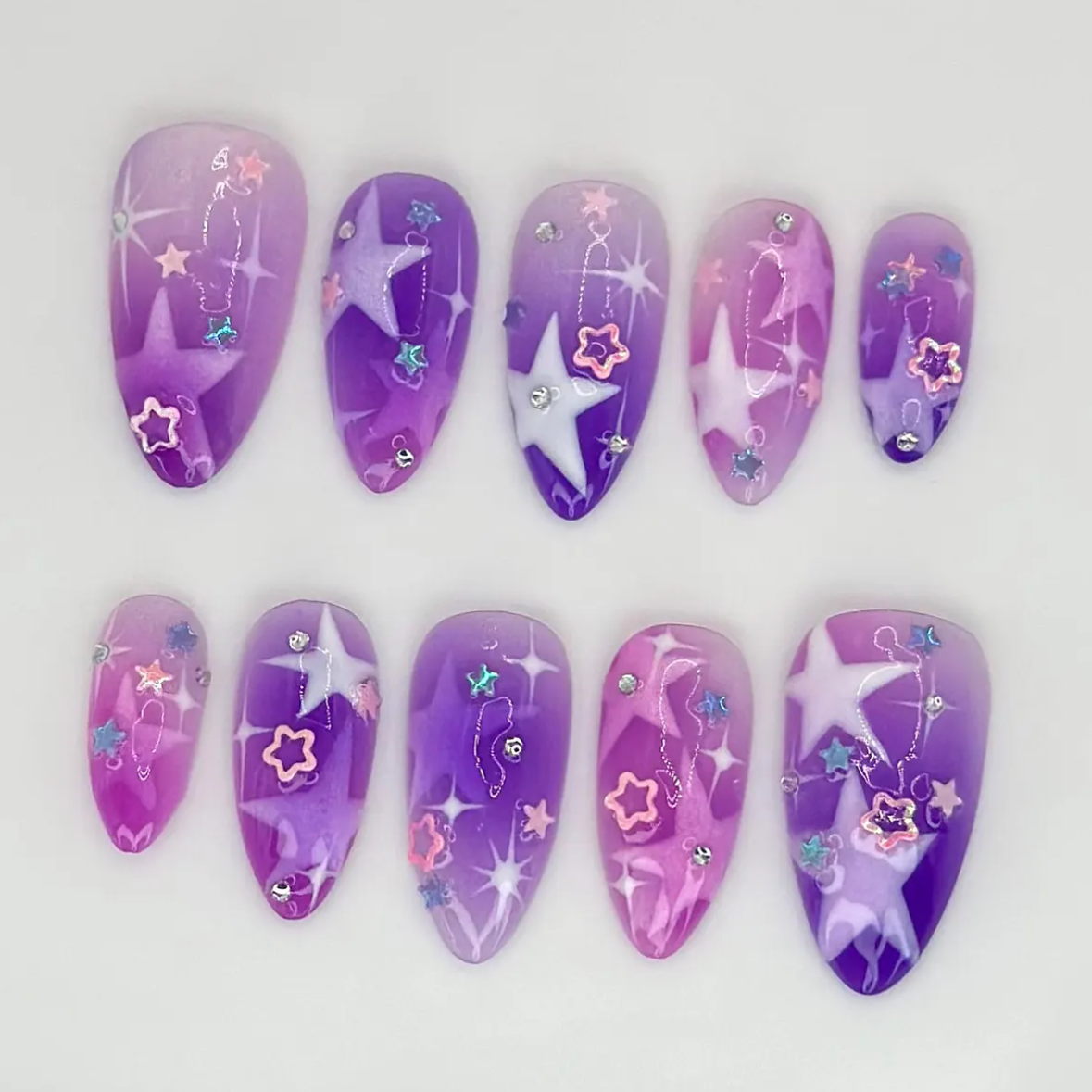 Shine bright with these Galaxy Dream press-on nails, blending purple and pink gradients with shimmering star accents. Each handmade nail captures celestial beauty for a dreamy, space-inspired look. Perfect for cosmic nail lovers, festivals, or anyone craving galaxy-inspired, reusable, customizable nail art.