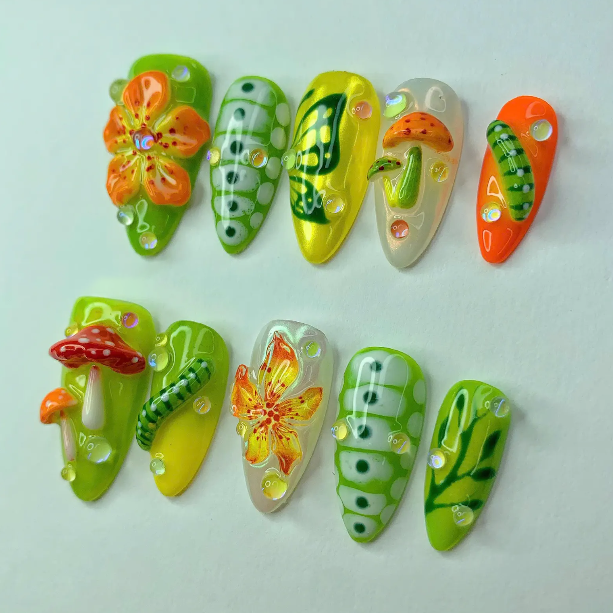 Bring whimsical charm with these handmade 3D nature press on nails featuring butterflies, mushrooms, and floral details in green and orange tones. Perfect fairycore nails, aesthetic nails, and reusable false nails. Long coffin nails add playful, magical style, ideal for festivals, cosplay, or everyday enchanted nail looks.