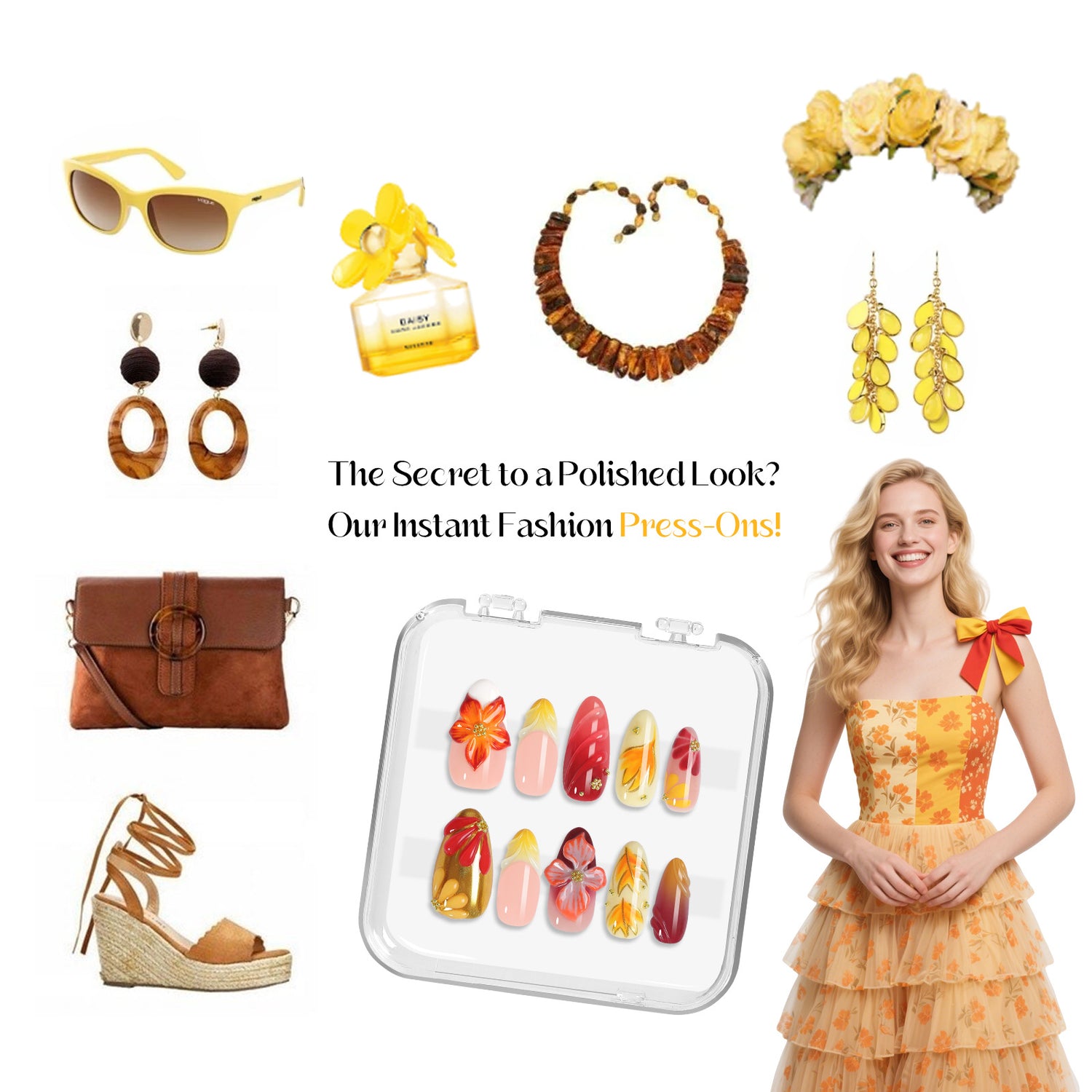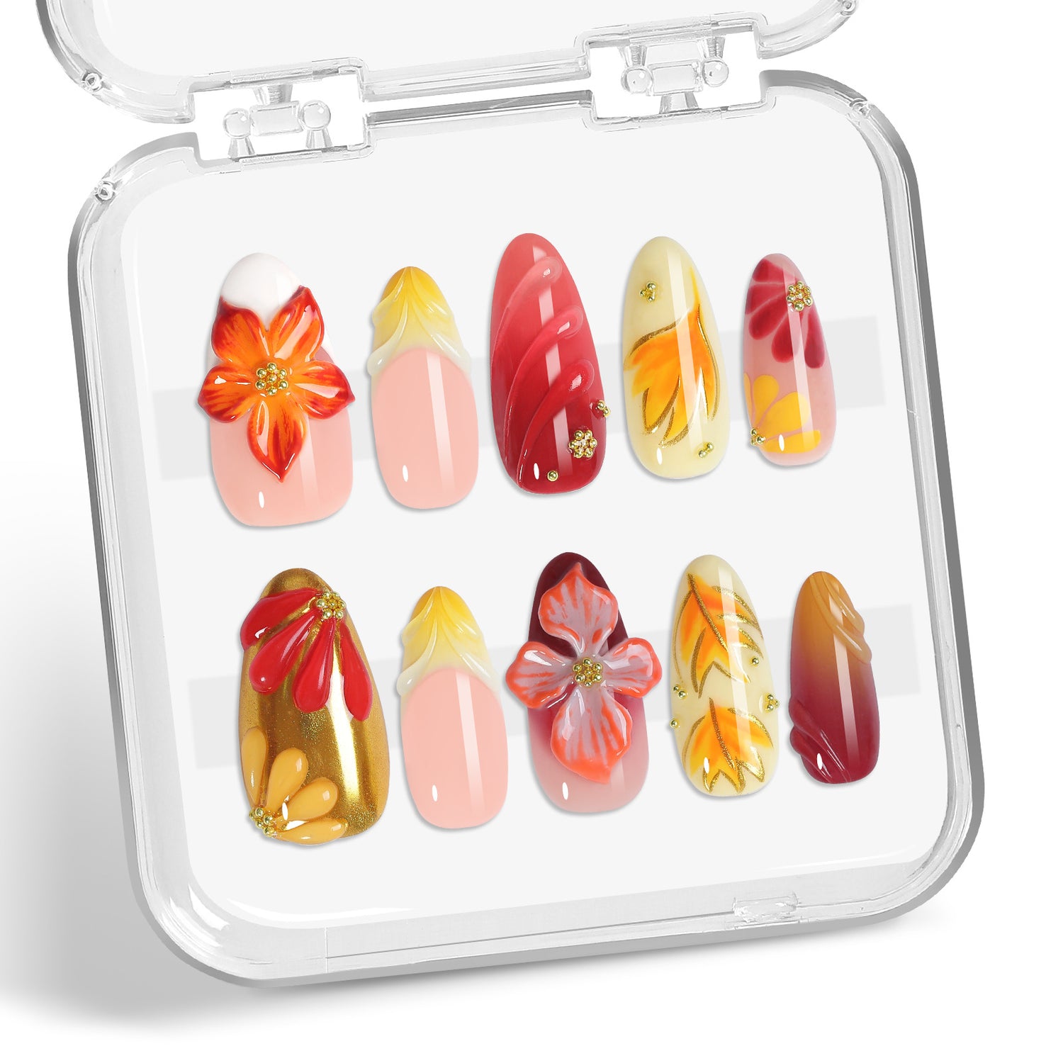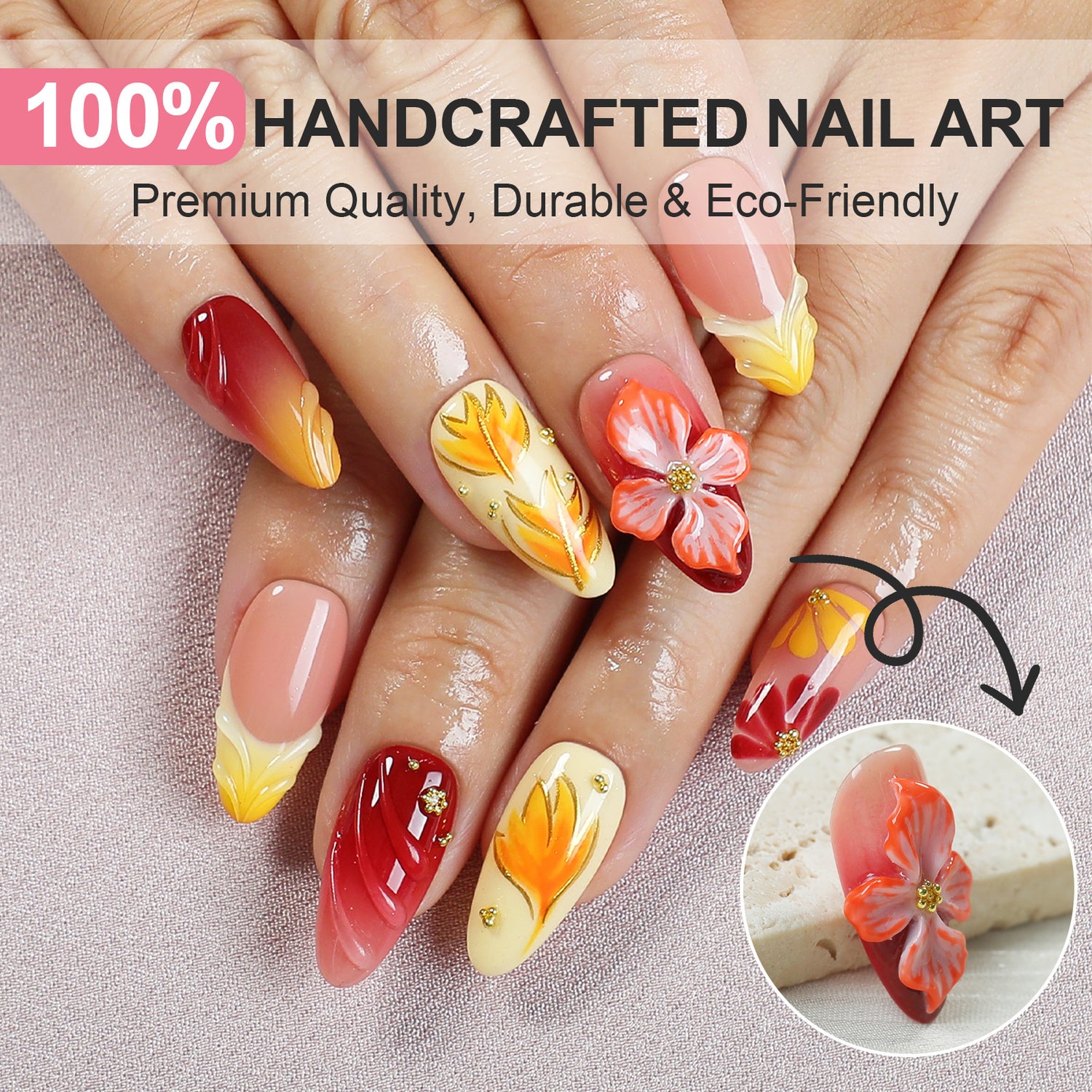 Celebrate autumn beauty with our Maple Bloom handmade press-on nails. Featuring 3D floral accents and maple leaf designs, these reusable fake nails bring cozy fall vibes to your manicure. Perfect for Thanksgiving, autumn weddings, or everyday style, this elegant floral nail art combines durability, comfort, and seasonal charm. A must-have for fall nail lovers.