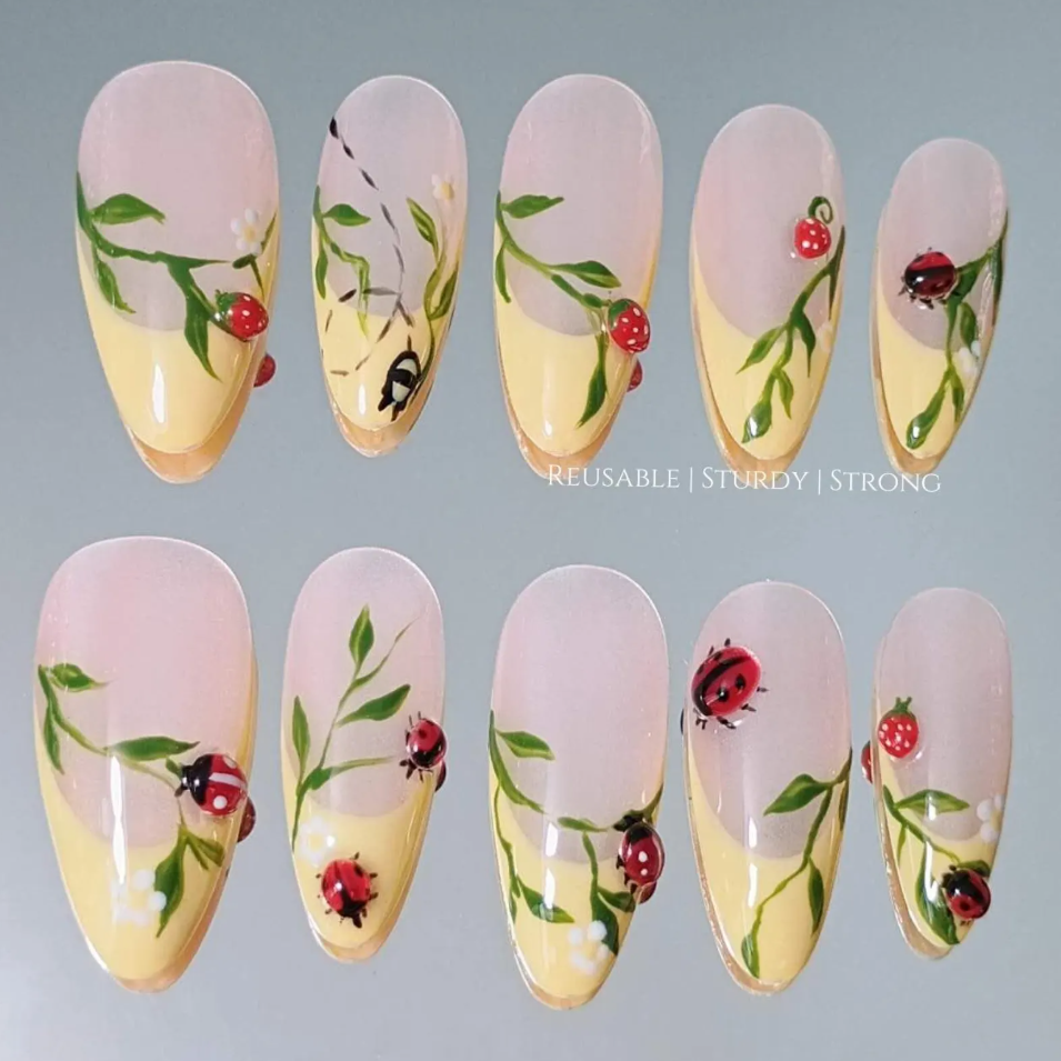Bring nature’s cuteness to your fingertips with our Cute Ladybug on Leaf Press On Nails. These reusable gel acrylic fake nails feature a vibrant red ladybug design on a fresh green leaf. Handmade and durable, available in short, medium, and long lengths — the perfect gift for nail art lovers.