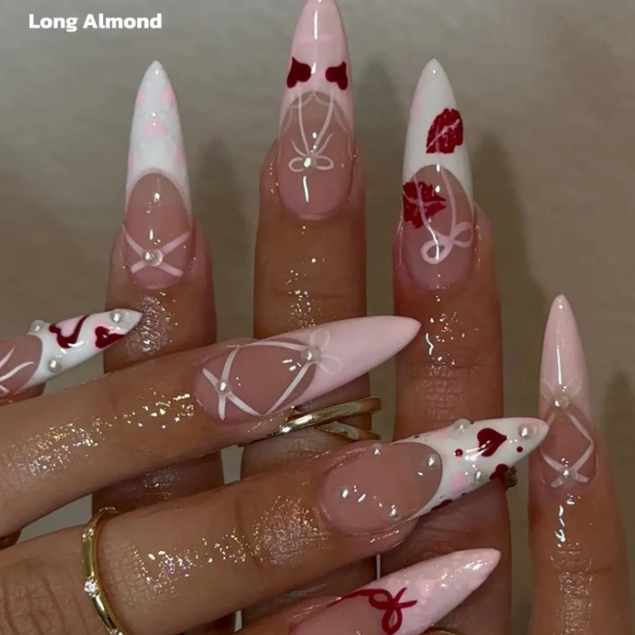 Fall in love with these Love Note Press-On Nails, featuring hand-painted hearts, delicate bows, and a romantic design. Perfect for soft girl nails, coquette aesthetics, or date night nails. Easy to apply, reusable, and durable, these fake nails bring salon-quality nail art straight to your fingertips without the cost.