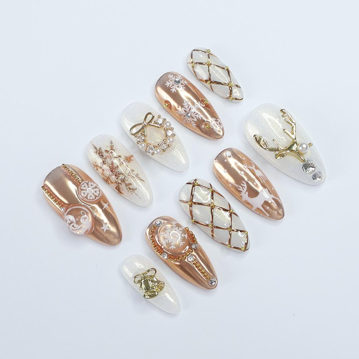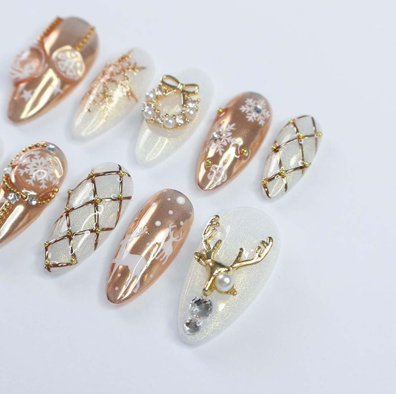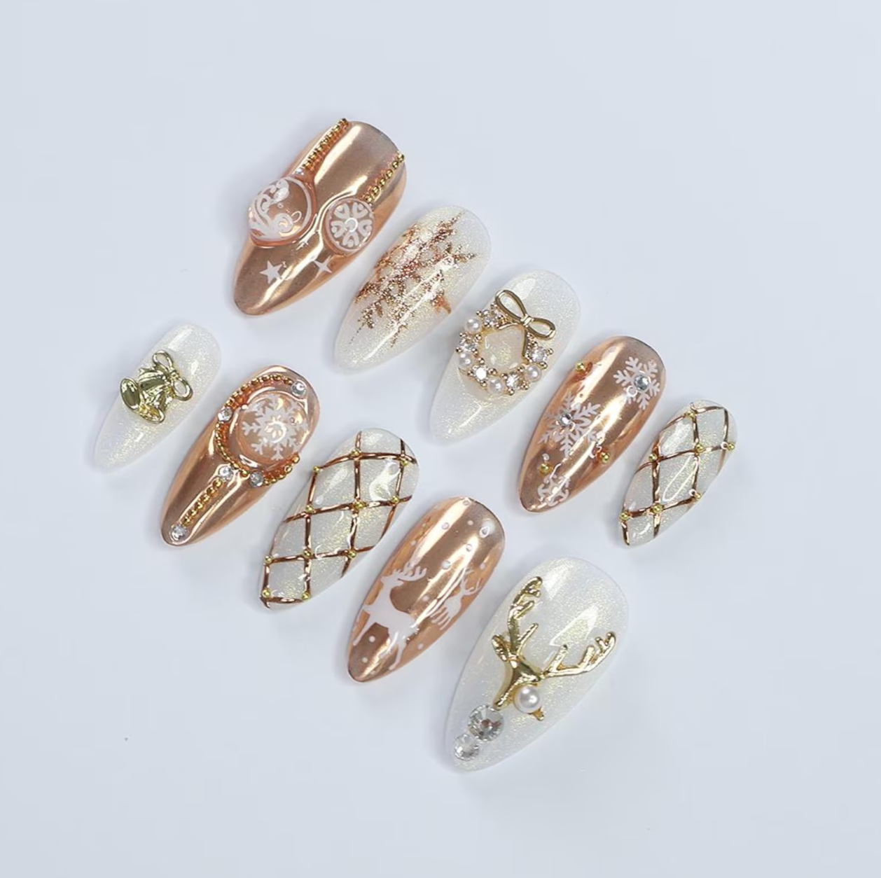 Celebrate the holidays with these festive reindeer press on nails featuring elegant laurel wreath accents and a medium almond shape for a chic seasonal look. Perfect as a Christmas gift for her, these holiday press on nails add warmth, sparkle, and charm to your winter style — easy to apply and reusable.