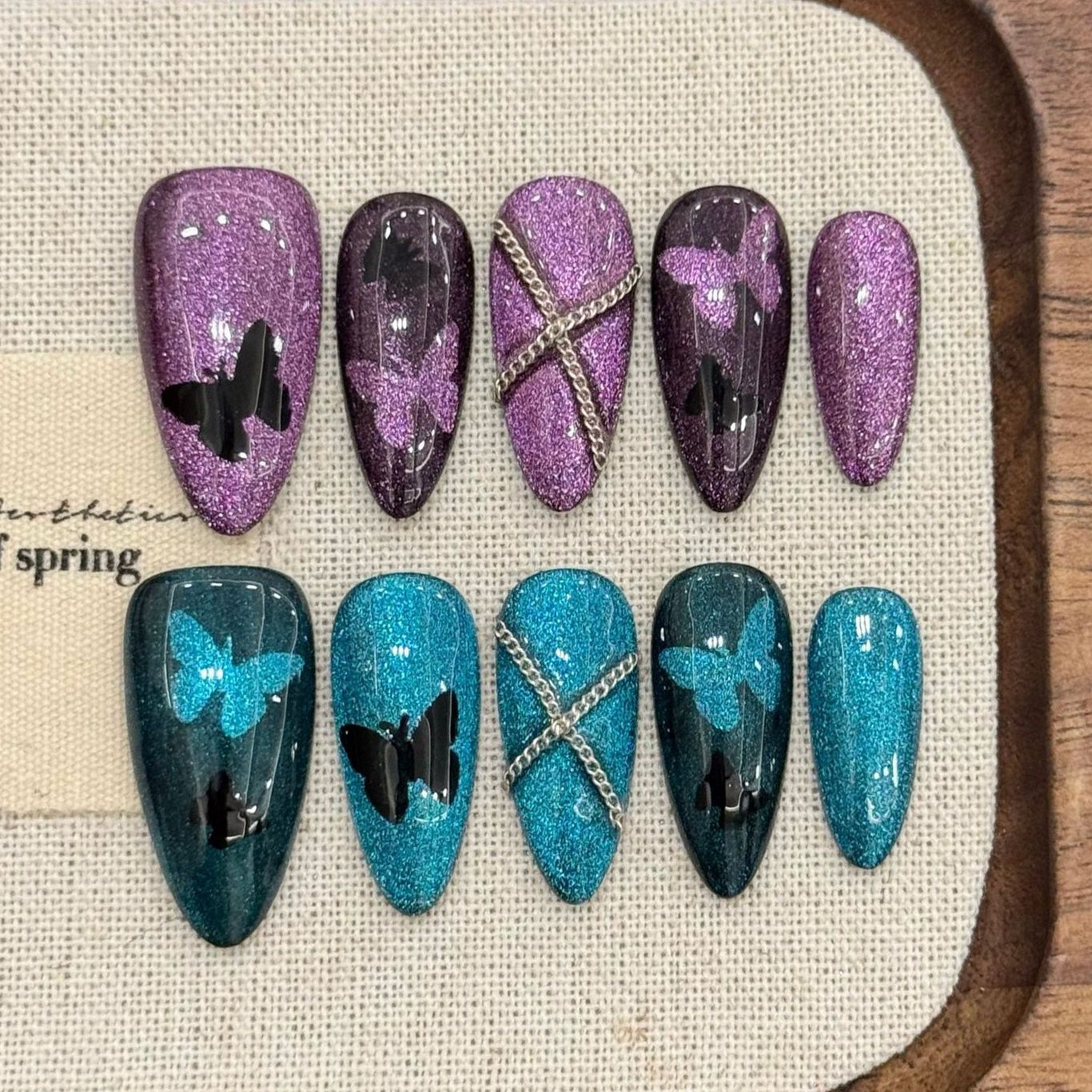 Step into playful sophistication with Butterfly Chain press-on nails from Glowyshe. Showcasing a luminous blue-purple cat-eye base, this design features delicate cut-out butterfly accents paired with edgy chain details. The blend of sweetness and coolness makes it an irresistible choice for trendsetters who love a daring yet elegant look.