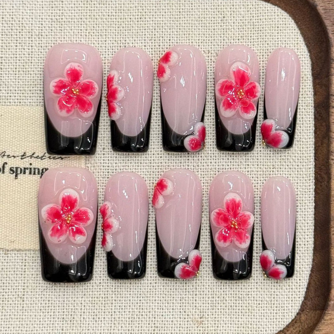 Unveil bold elegance with Dark Bloom press-on nails from Glowyshe. Featuring a sleek black French tip paired with intricate 3D carved floral details, this design channels dark romance with a refined edge. Perfect for making a statement at night outs, parties, or whenever you want to embrace your inner gothic chic.