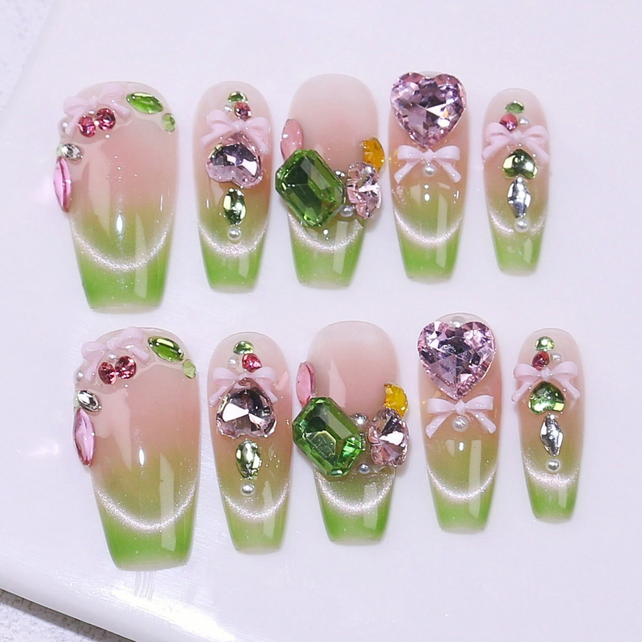 Embrace the enchanting beauty of Forest Glow press-on nails from Glowyshe. Featuring a radiant cat-eye base with a soft green hue, this design highlights a unique smile French tip style. Adorned with sparkling rhinestone accents, it brings depth, elegance, and a hint of mystical forest charm to your look. Perfect for both everyday wear and special occasions.
