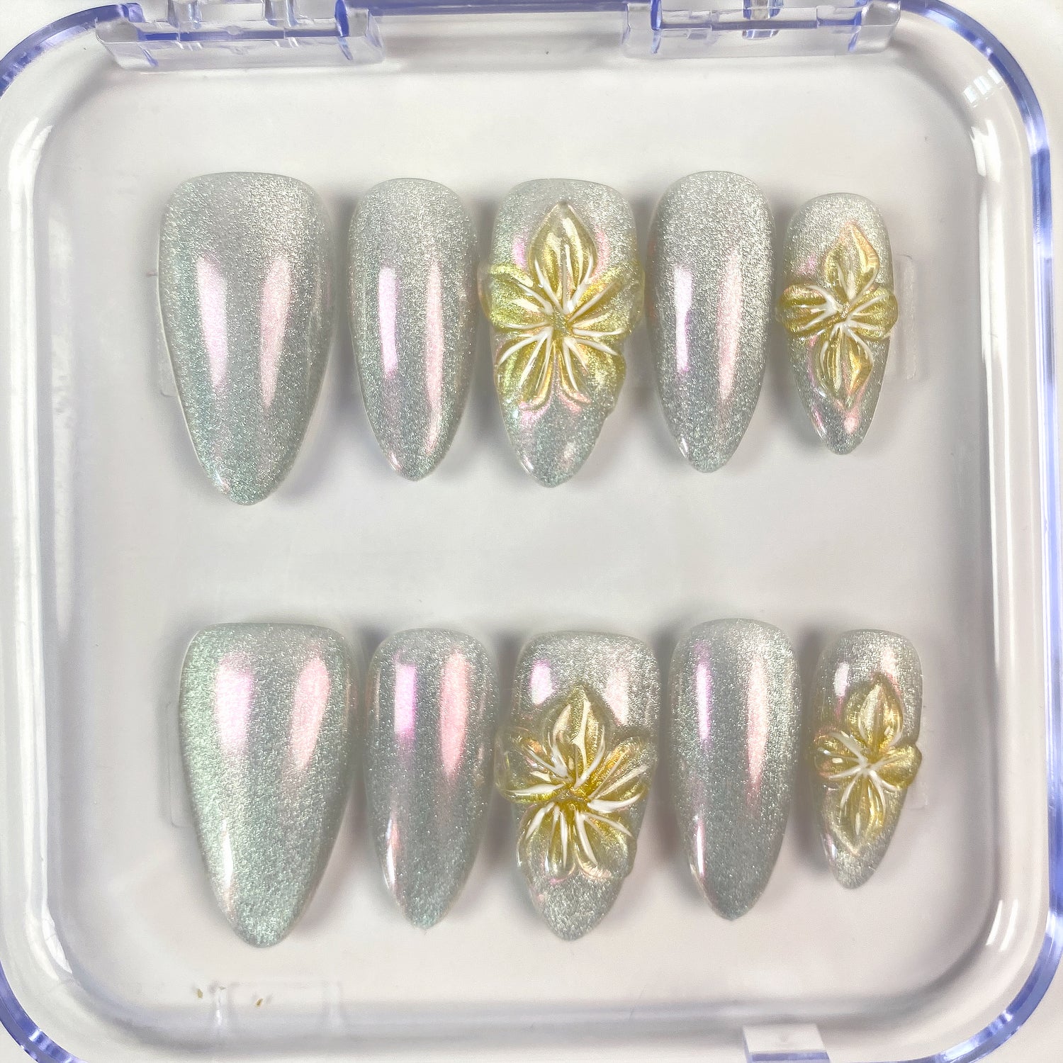 Step into summer with the vibrant glow of Citrus Bloom press-on nails from Glowyshe. Featuring a radiant orange-to-green ombre on a soft nude base, this set shines with delicate 3D floral accents. Medium almond tips offer a flattering shape, blending tropical charm and handcrafted elegance for a fresh, lively manicure.