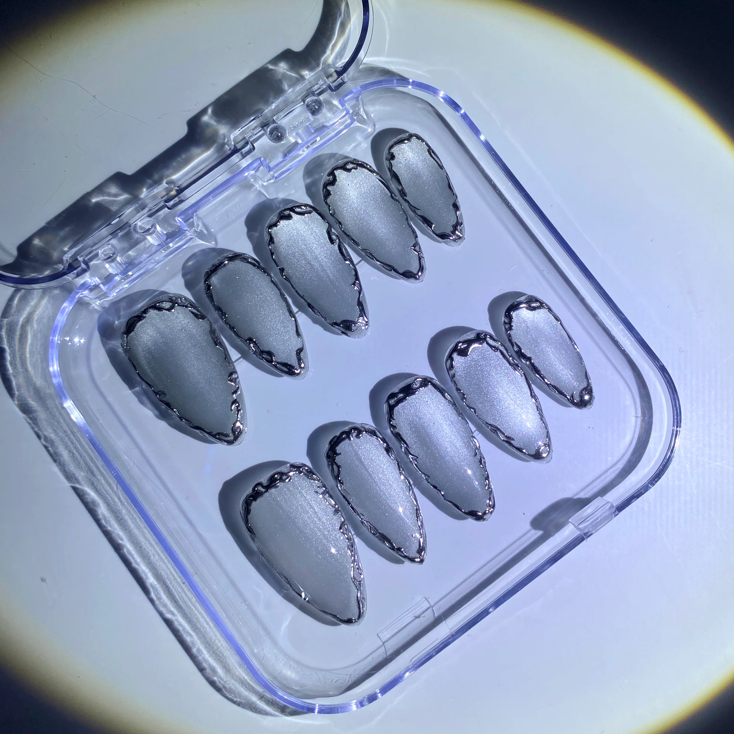 Step into sleek sophistication with Silver Edge press-on nails from Glowyshe. Featuring a lustrous cat-eye effect in cool tones, each nail is outlined with refined silver metallic edges for a modern, polished look. Perfect for adding a touch of futuristic elegance to any outfit.