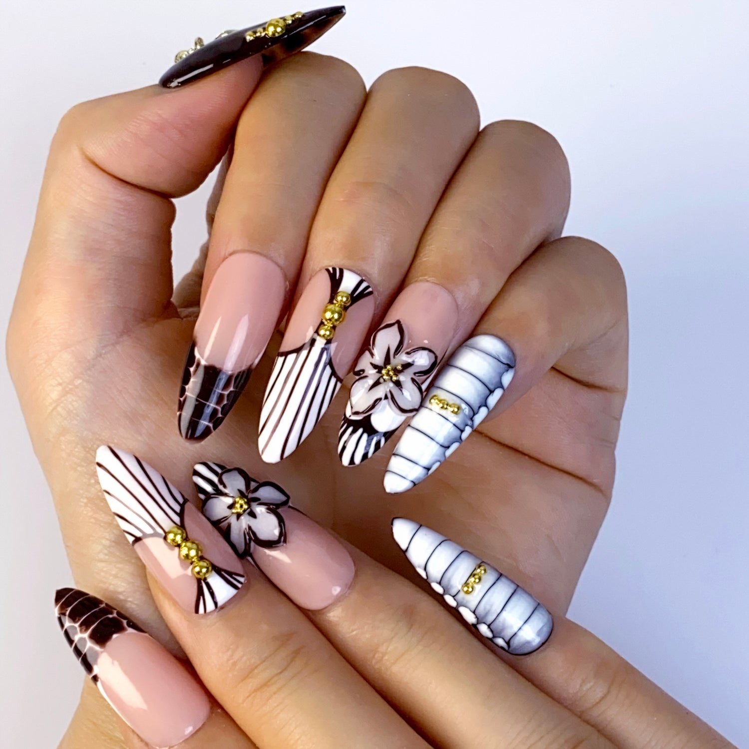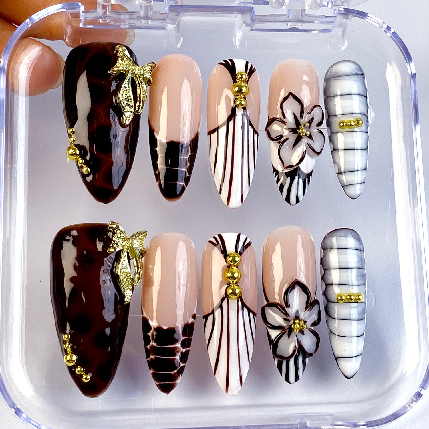 Channel earthy elegance with handmade press-on nails in rich brown shades. Featuring 3D floral details, metallic beads, and snake-skin patterns, these acrylic nails capture the essence of fall-winter fashion. Reusable and durable, they’re perfect for anyone looking for stylish seasonal press-on nails with a bold twist.