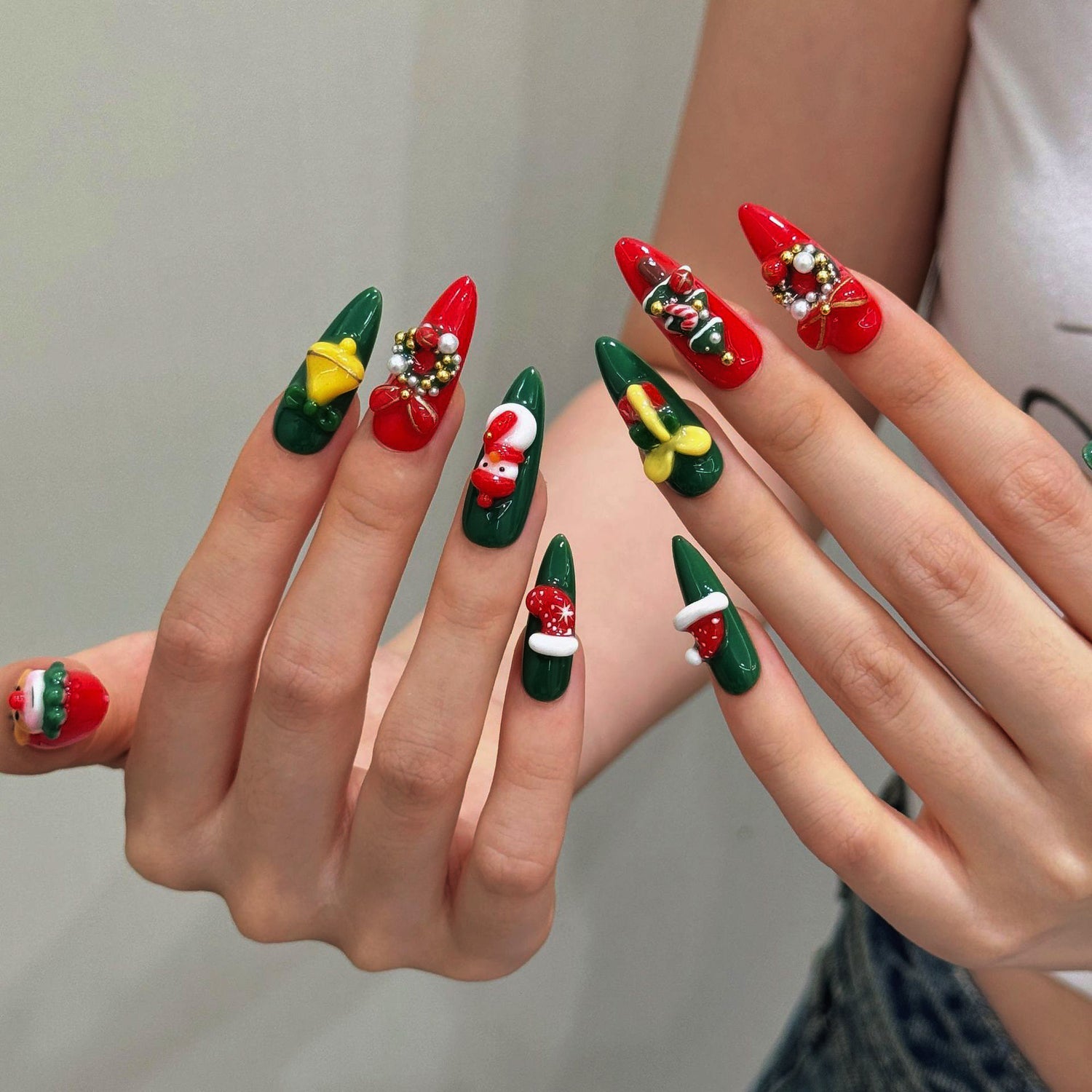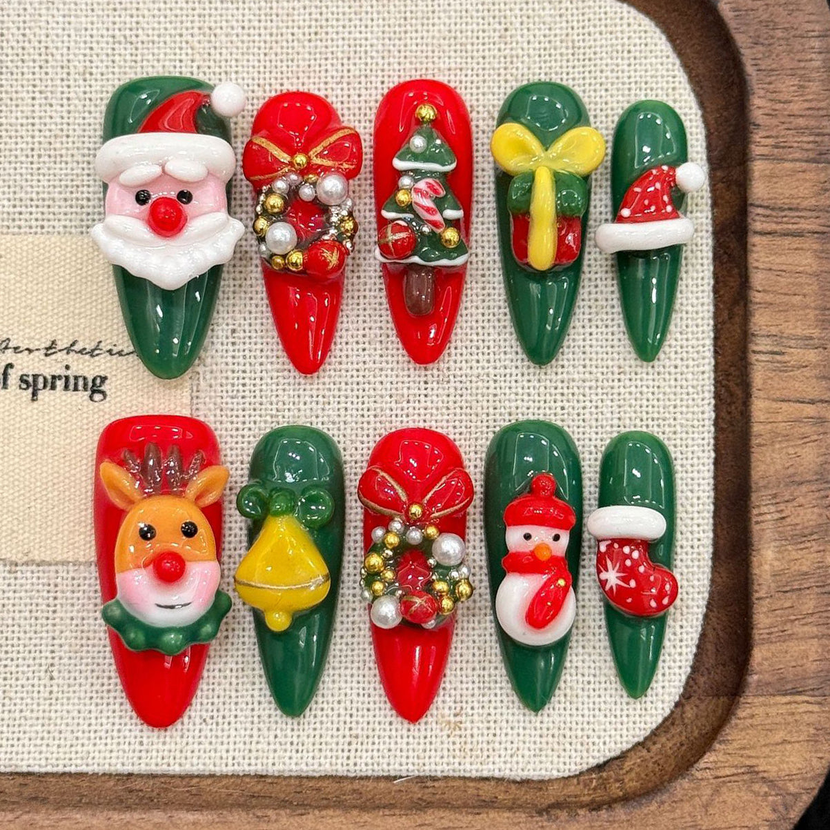 Bring holiday cheer to your fingertips with these handmade press-on nails featuring 3D Santa Claus, reindeer, and snowman accents. The festive red and green design captures the classic Christmas spirit, making them perfect for Christmas parties, winter celebrations, or holiday gifts. Reusable, durable, and easy to apply for a salon-quality look at home.