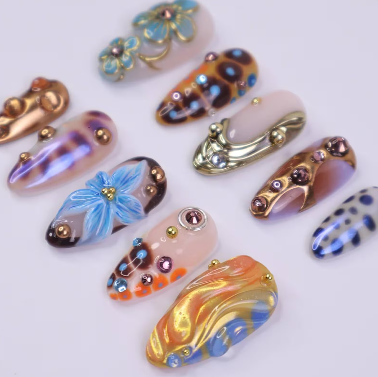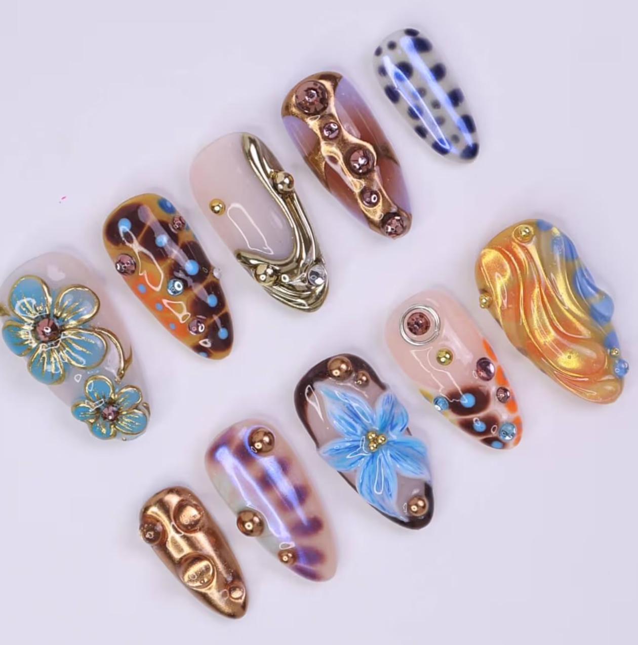 These blue press on nails combine 3D flowers with bronze chrome for an earthy metallic finish. Designed in a medium almond shape, they’re perfect for vacation nails, summer parties, and Y2K-inspired nail art trends. Lightweight, reusable, and handmade, they offer quick, stylish fake nails with a unique, eye-catching glow.