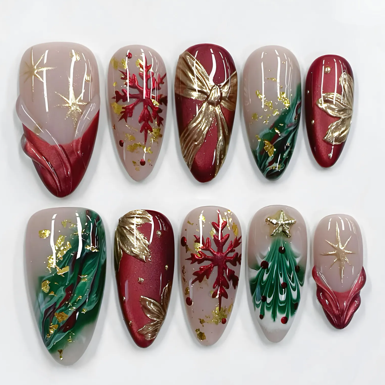 These Festive Red, Green & Gold Christmas Press On Nails bring glamorous winter style with shimmering snowflakes, 3D bows, and elegant holiday accents. Ideal for Christmas nail art, winter parties, and everyday holiday wear, this handmade set is reusable, lightweight, and designed to elevate any festive look effortlessly.
