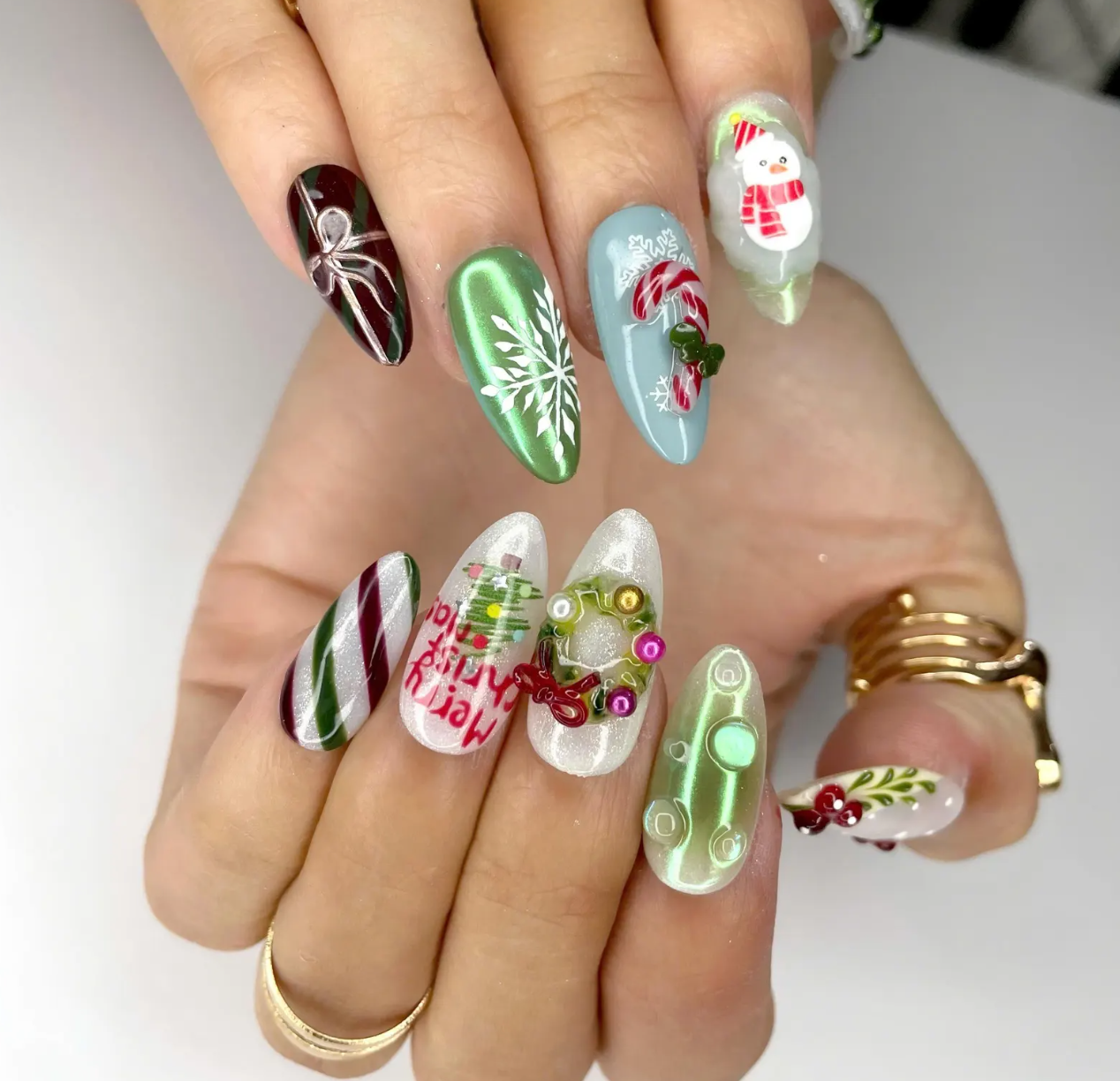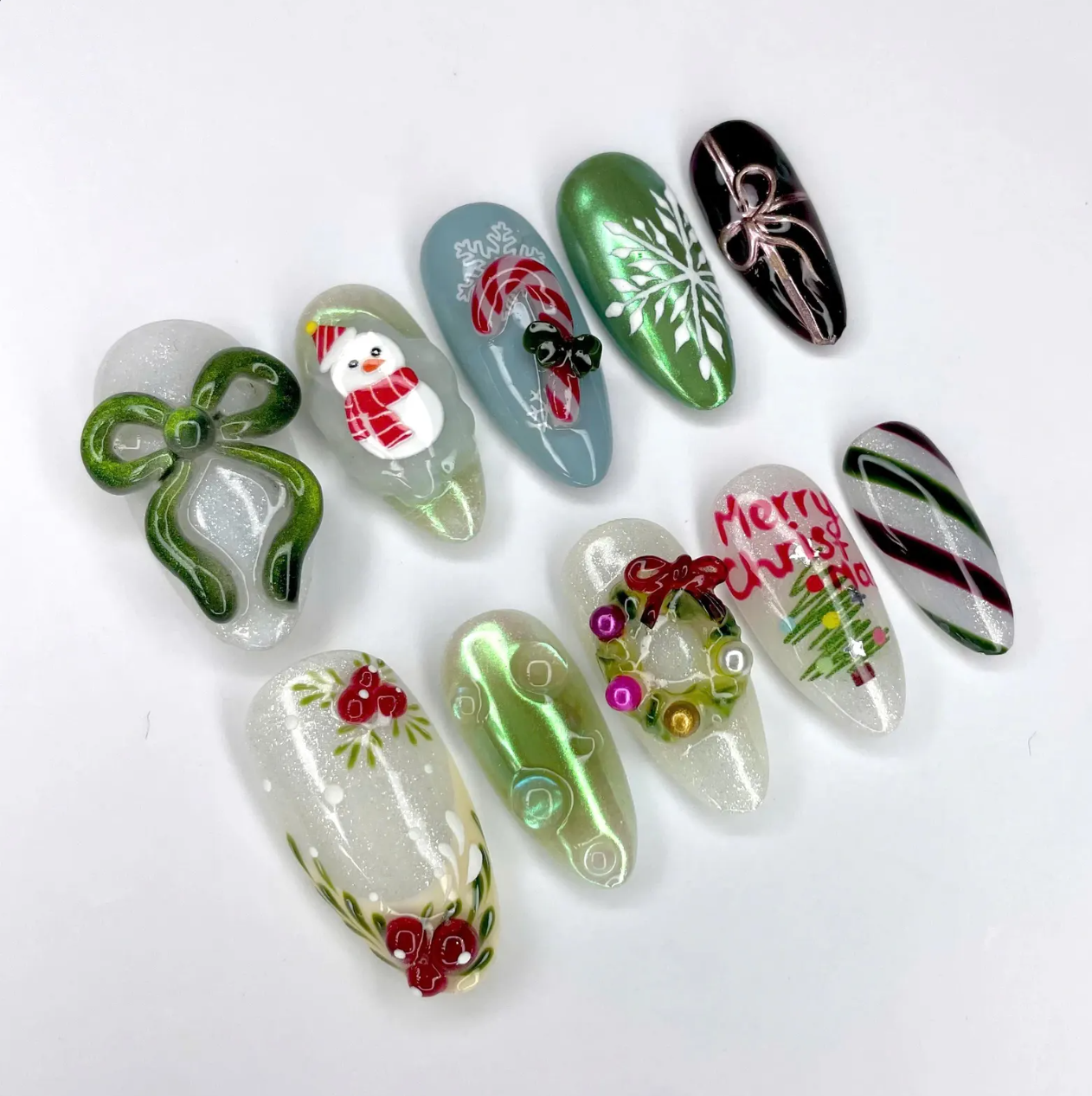 Jingle Sparkle press-on nails showcase shimmering red and gold holiday colors with snowflakes, bows, and Christmas tree accents. This glittery nail art set adds bright, festive charm to any winter outfit. Perfect for Christmas nails, seasonal nail art, glitter nails, and easy press-on nails for holiday parties and celebrations.