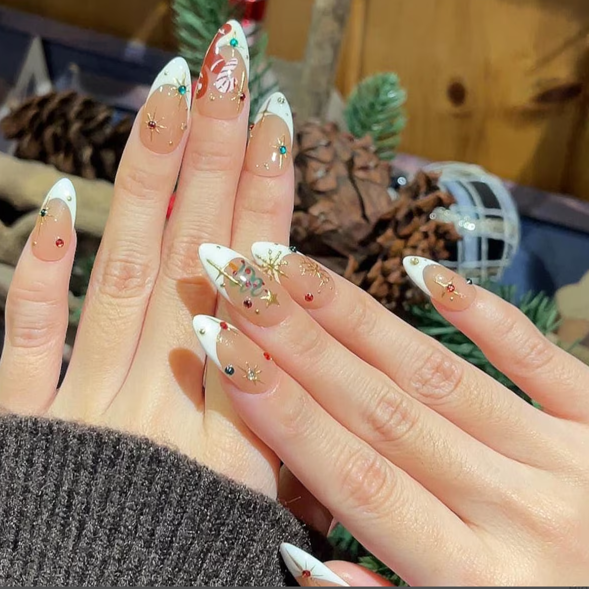 Our White French Christmas Press On Nails blend classic elegance with festive charm. Featuring Christmas trees, candy canes, and shimmering red-green-gold details, this handmade holiday set is perfect for winter gatherings. Get a salon-perfect manicure that lasts through every celebration.
