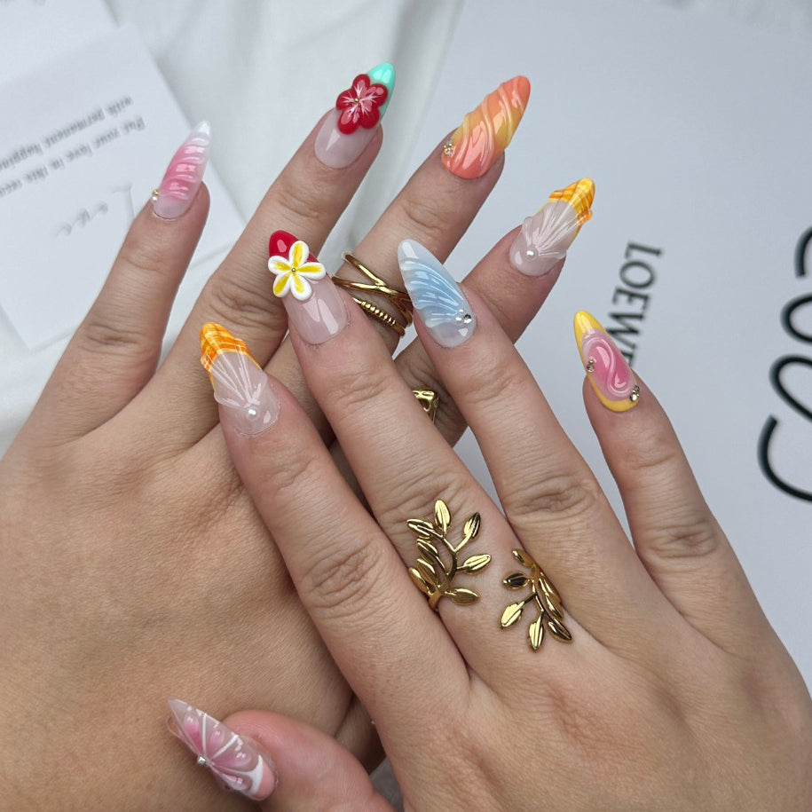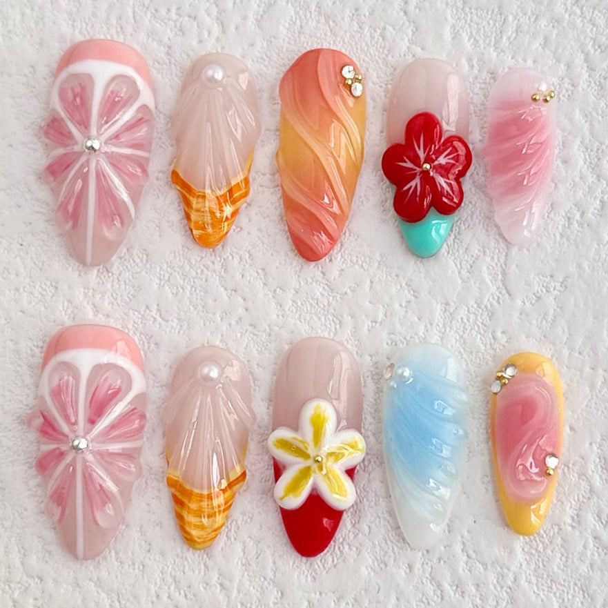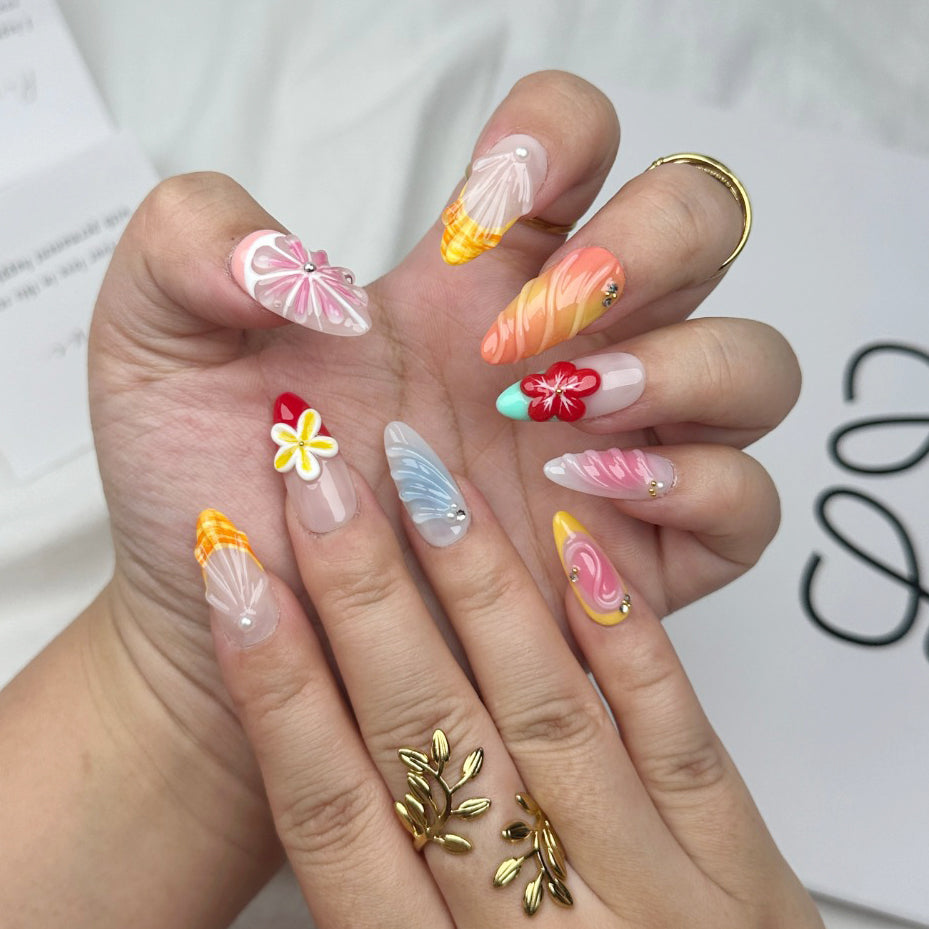 Brighten your look with the Lemon Zest press-on nails. Featuring playful 3D lemon carvings and a vibrant mix of colors, this handcrafted set brings a burst of citrusy charm to your fingertips. Fun, fresh, and full of personality — perfect for sunny days and bold style statements.