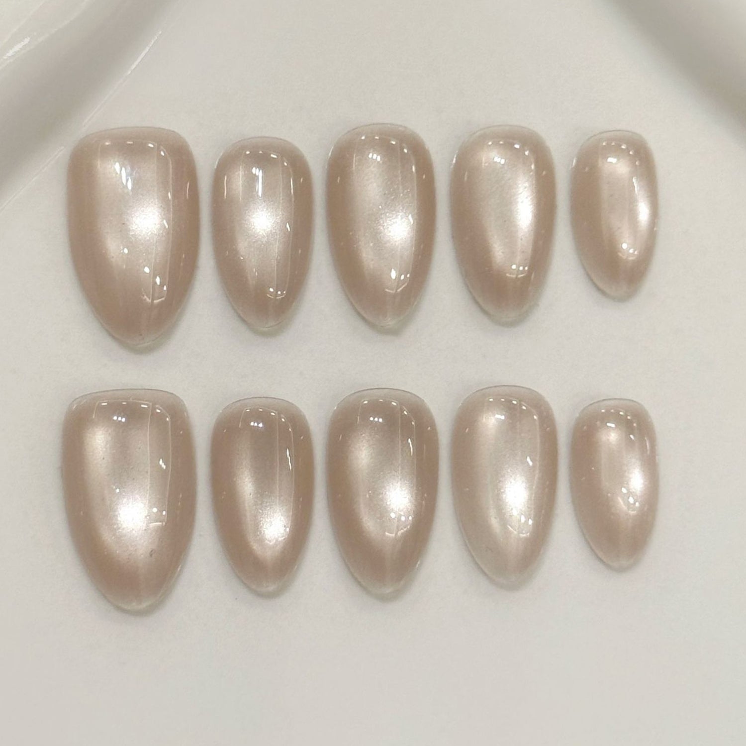 Shine bright with Light Chase press-on nails from Glowyshe. Featuring luminous cat-eye lines that shift with the light and delicate glass bead accents, this design offers a sleek, radiant appearance. Its mesmerizing glow adds a futuristic yet elegant edge, ideal for making a bold fashion statement anytime.