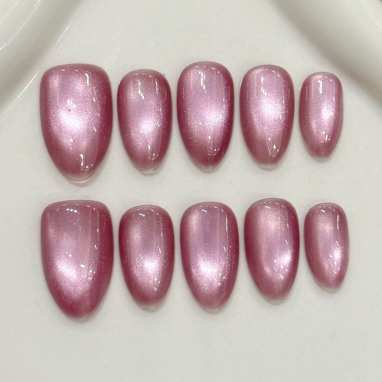 Indulge in the delicate beauty of Rose Beam press-on nails from Glowyshe. Featuring a soft rose-pink base enhanced with sparkling cat-eye glass bead effects, this design glows with romantic charm. Elegant yet dazzling, Rose Beam adds a touch of refined femininity to both casual and formal occasions.