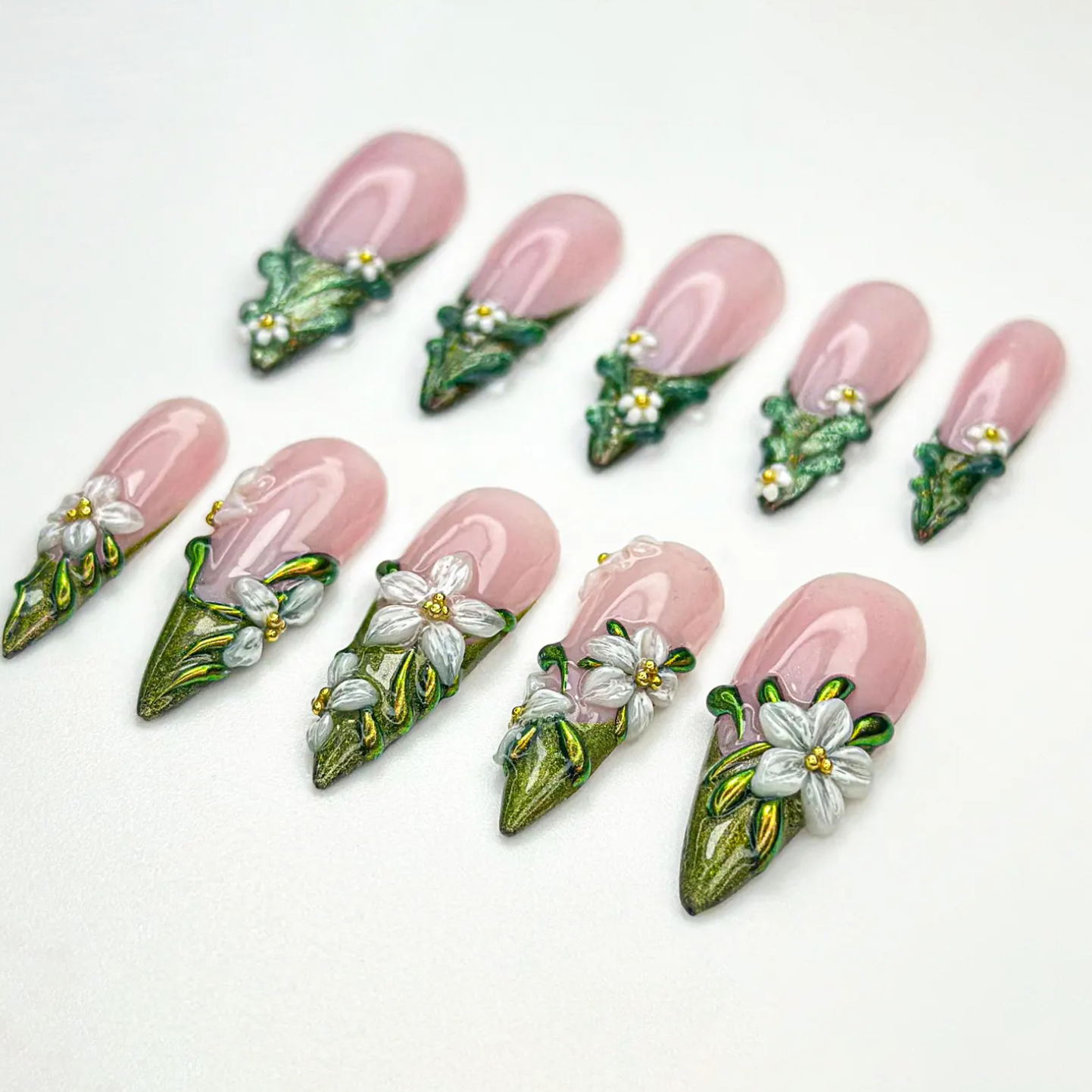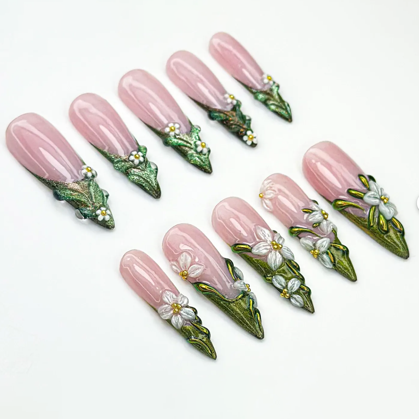 Step into an enchanted forest with these moss green 3D floral press on nails. Inspired by fairycore and elfcore aesthetics, this nature nail set features handcrafted blossoms for a whimsical vibe. Easy to apply and reusable, these handmade fairy nails bring magical woodland beauty to your fingertips.