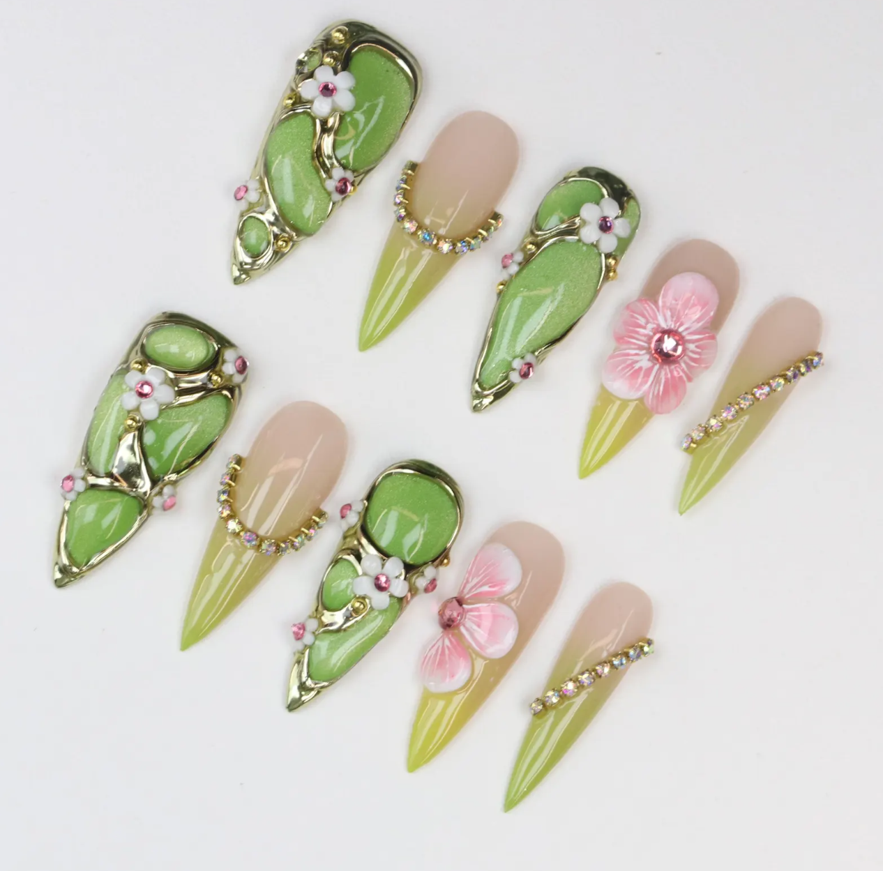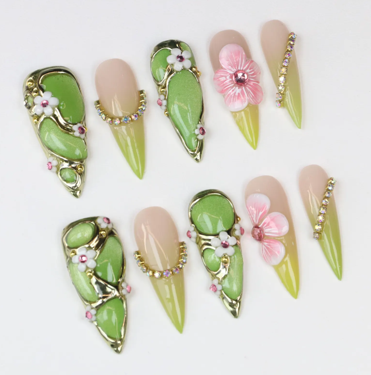 These Oriental Glam press on nails feature a mesmerizing cat eye effect, green gradient tones, and 3D pink floral nail art with gold trim. Perfect for lovers of Chinese-style nail art, these elegant press on nails offer a luxury manicure look in minutes. Ideal for fashion trends, long nails styling, and special occasions.