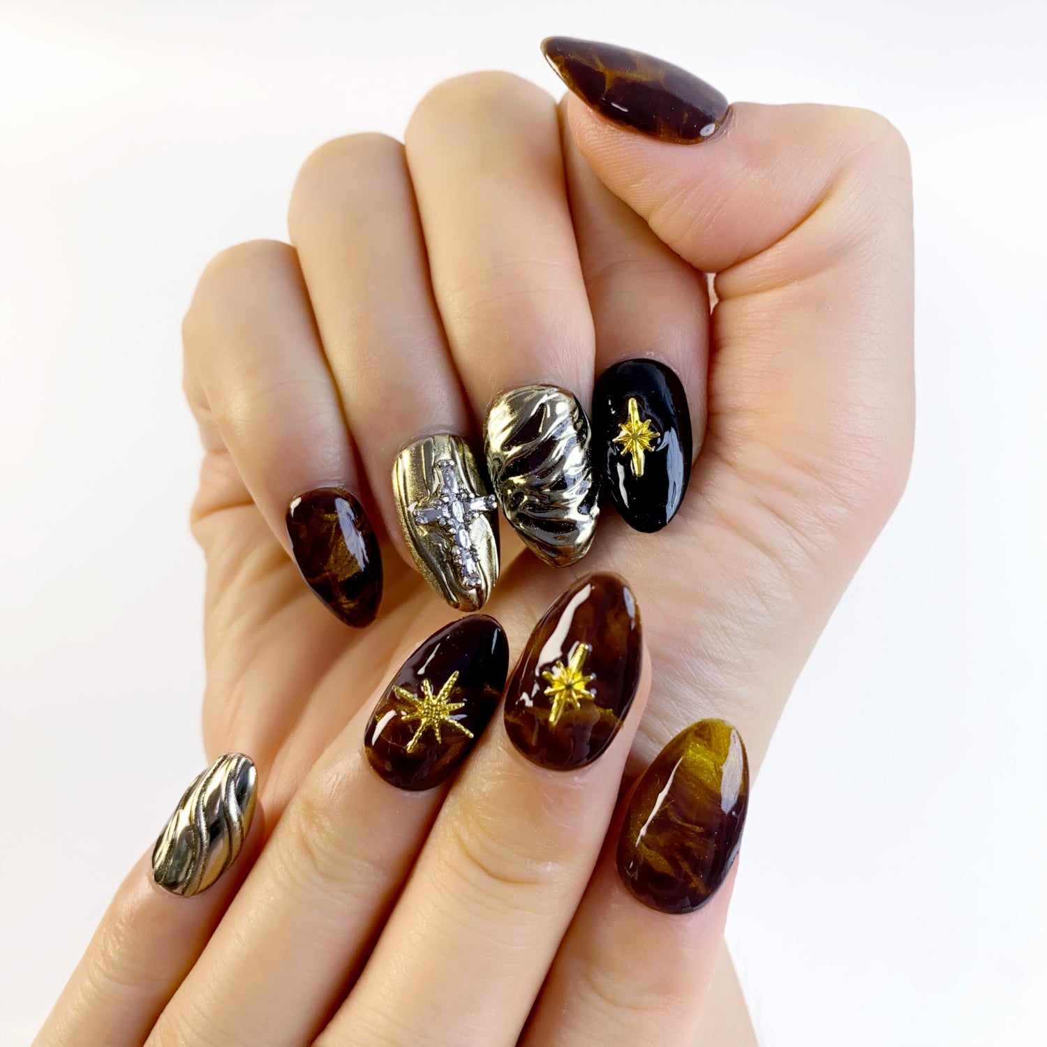 Elevate your nail art with Amber Cross Press On Nails. Designed with golden amber marble effect, cross and hexagram accents, these handmade coffin nails combine luxury and mystery. Ideal as reusable fake nails for gothic style, Christmas parties, or statement manicures that turn heads.