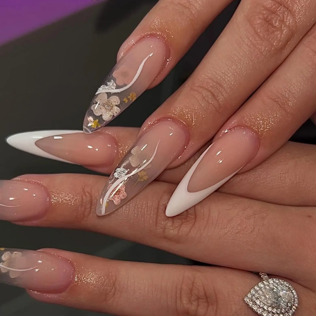 Delicate and romantic, these floral French tip press on nails feature hand-painted blossoms on a long almond shape. Perfect for bridal nails, birthday parties, or prom looks, these handmade gel nails combine soft femininity with elegant charm. Lightweight, reusable, and ready to enhance any outfit.