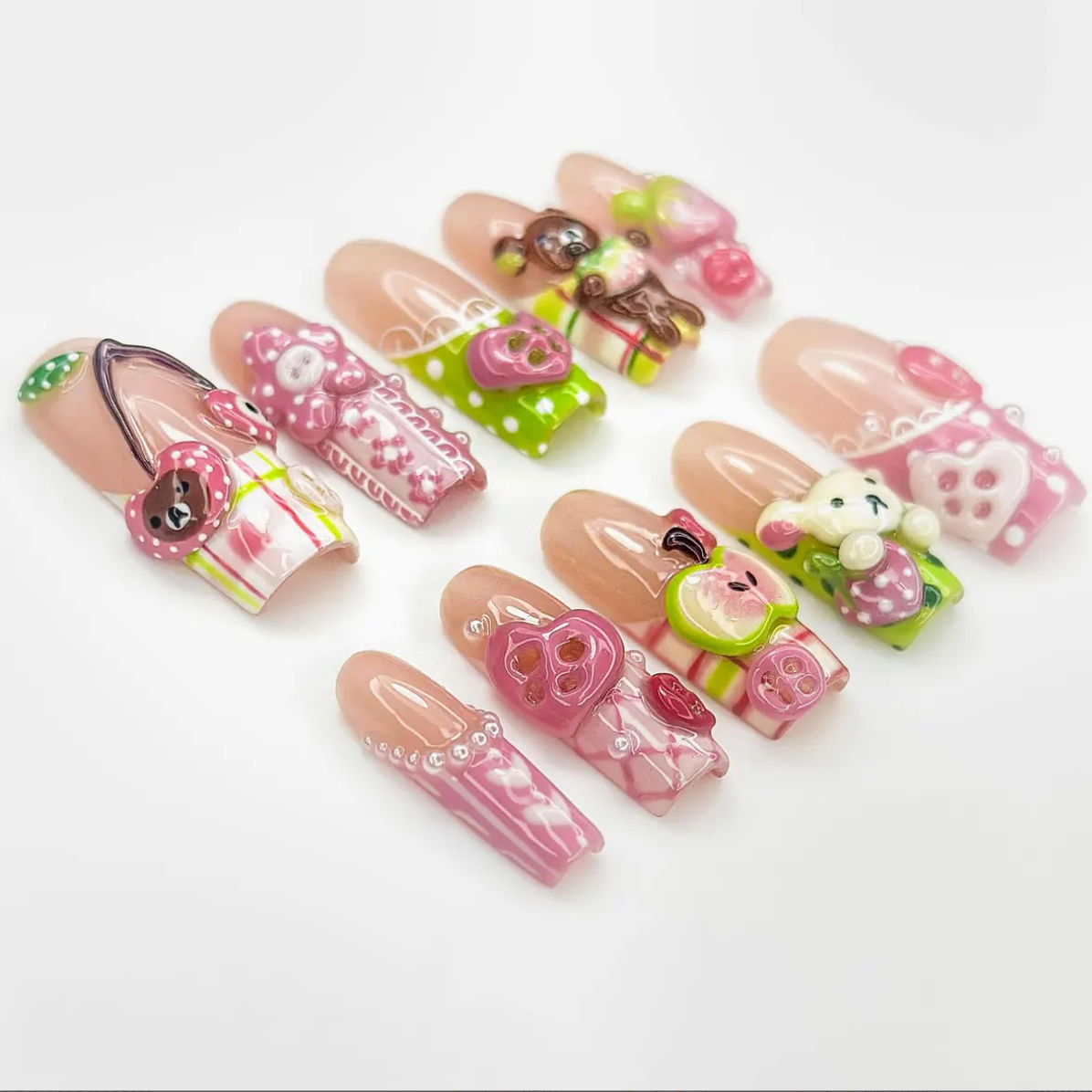 Bring playful charm to your look with these Kawaii Bear Candy Press-On Nails. Designed with 3D apple and cherry details, pastel pink and green hues, and a cute Y2K vibe, this handmade nail art set adds a fun, sweet aesthetic. Ideal for fans of cute nails and kawaii press-on nails.