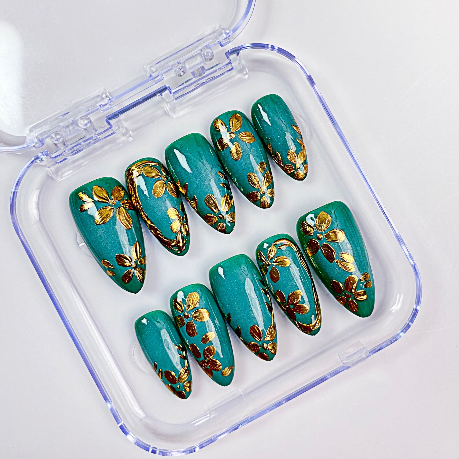 Step into elegance with Emerald Grace press-on nails from Ersa Nails. Featuring a rich green base adorned with intricate gold metal floral accents, this handcrafted design radiates sophistication and charm. The medium almond shape flatters every finger, making it the perfect choice for a stylish, nature-inspired statement look.