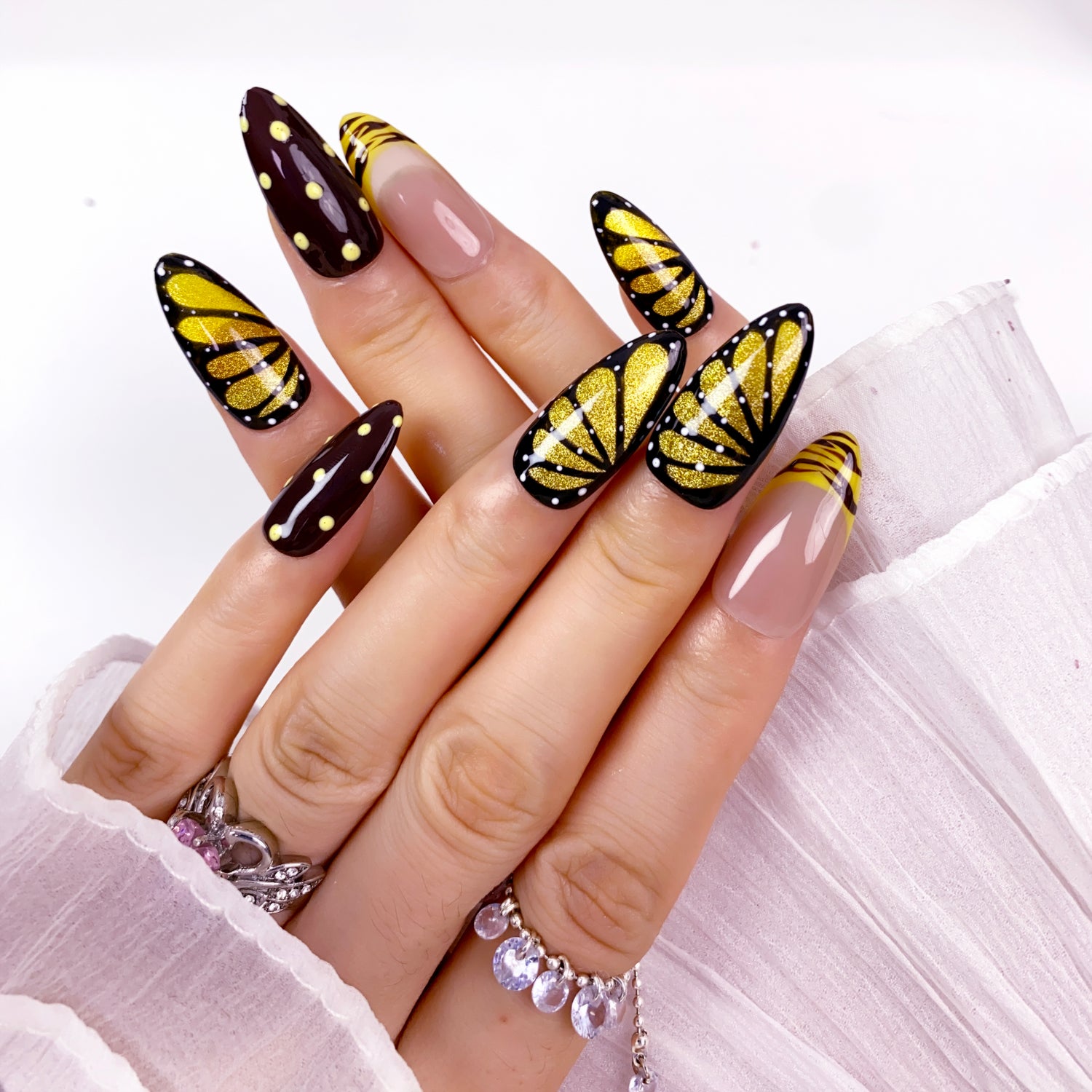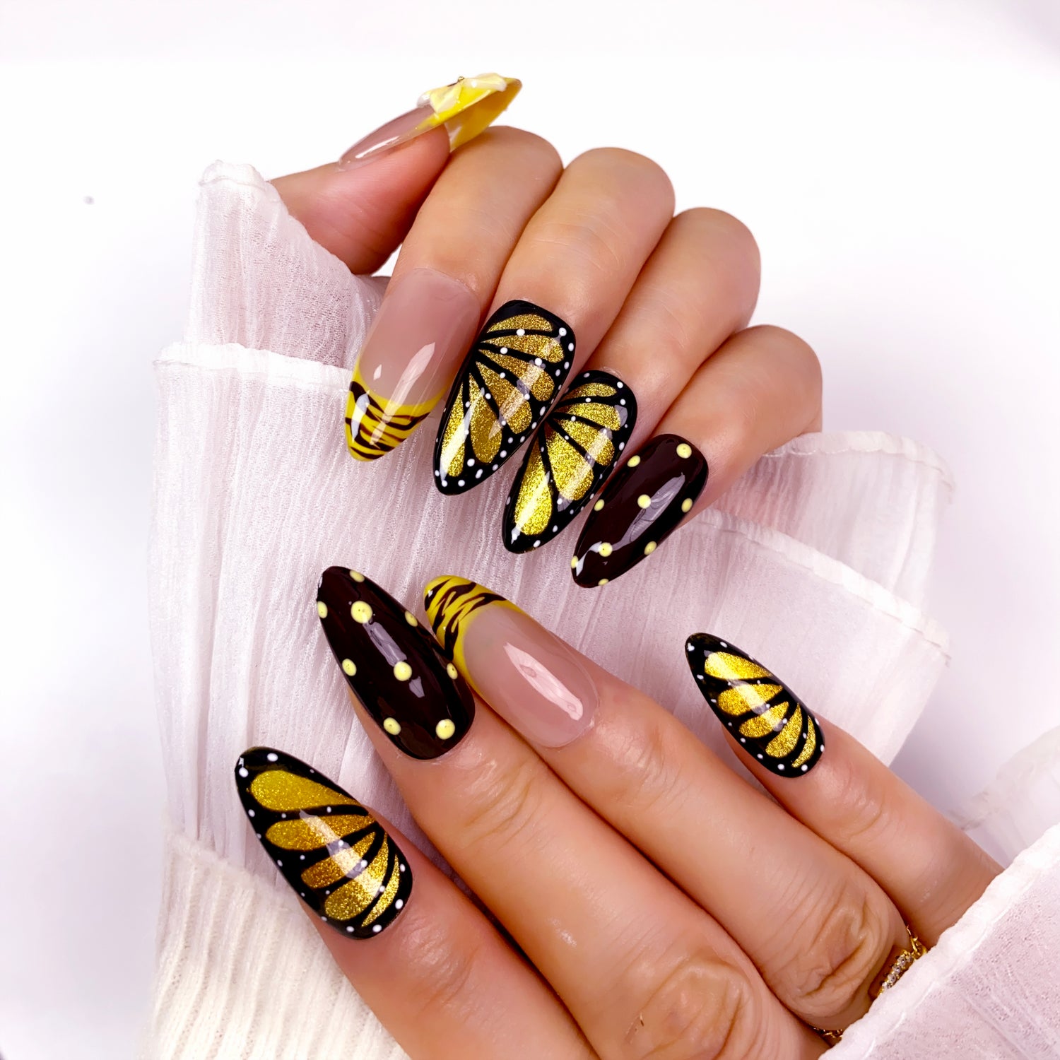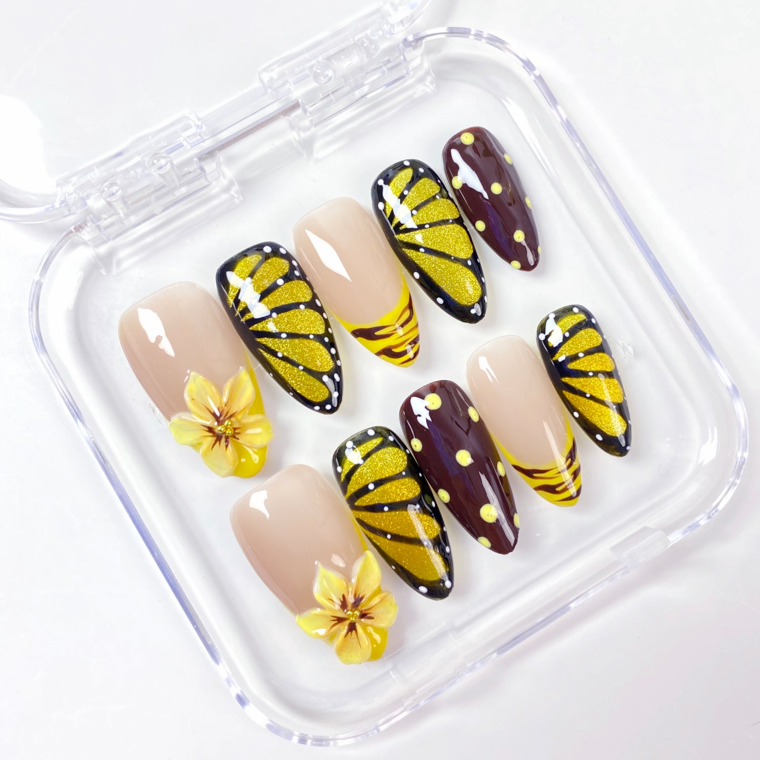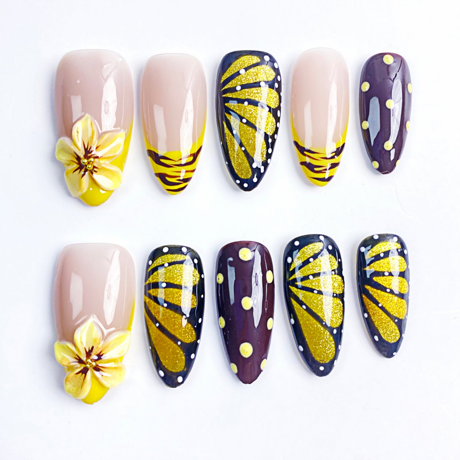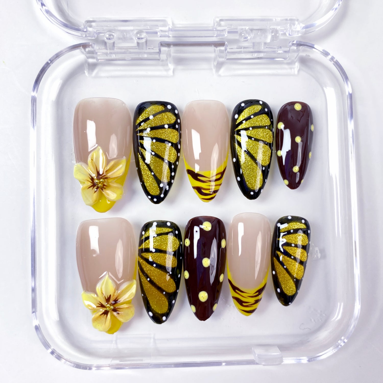 Immerse yourself in the striking elegance of Golden Bloom press-on nails. Featuring a bold zebra print base and luminous cat-eye gold details, these nails are brought to life with 3D yellow floral accents and butterfly wing embellishments. This playful yet sophisticated set is perfect for those who love to turn heads.
