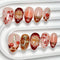 Warm up your fall look with handmade press-on nails in rich amber tones. Adorned with 3D flowers and cherry accents, these acrylic nails bring autumn-winter nail art trends to life. Reusable and long-lasting, they’re perfect for seasonal fashion lovers seeking cozy, stylish, and unique manicure designs.