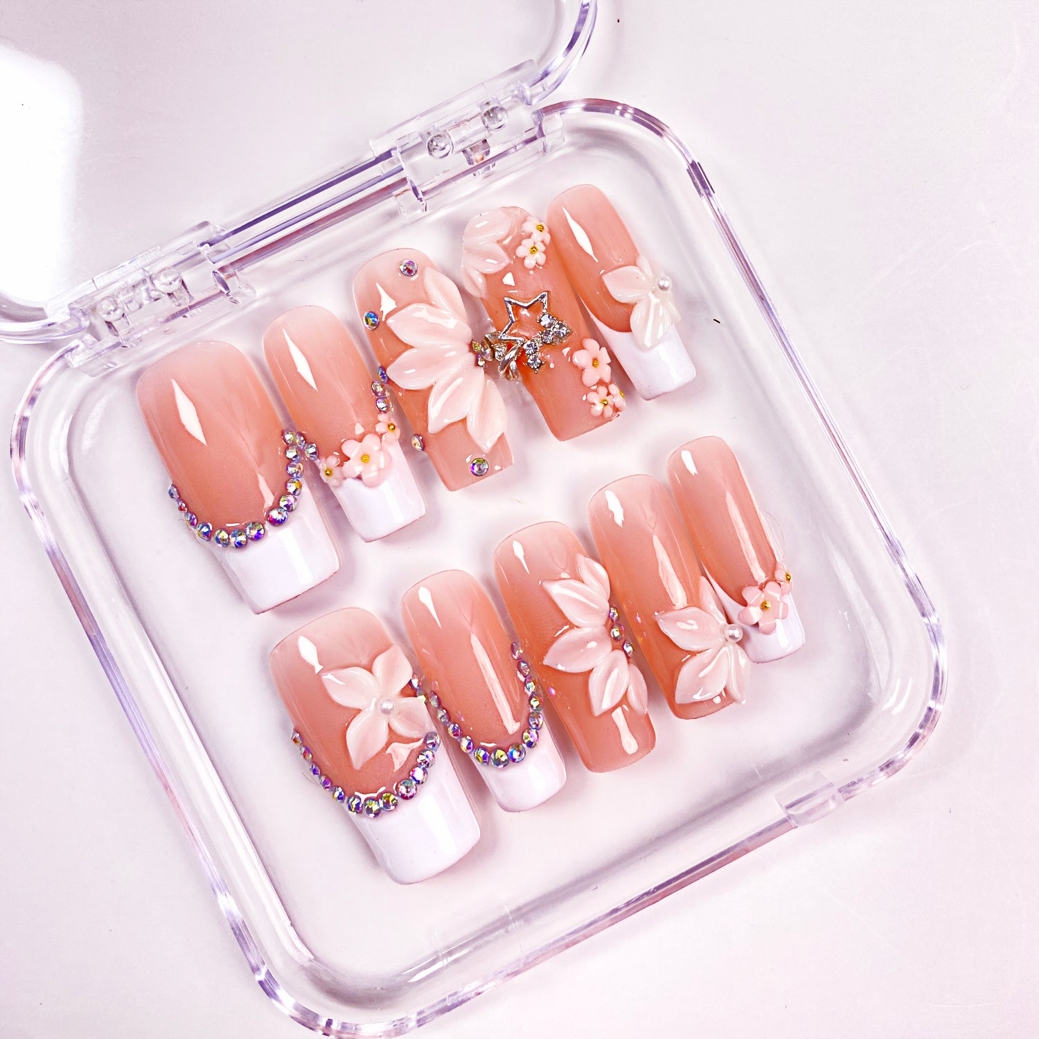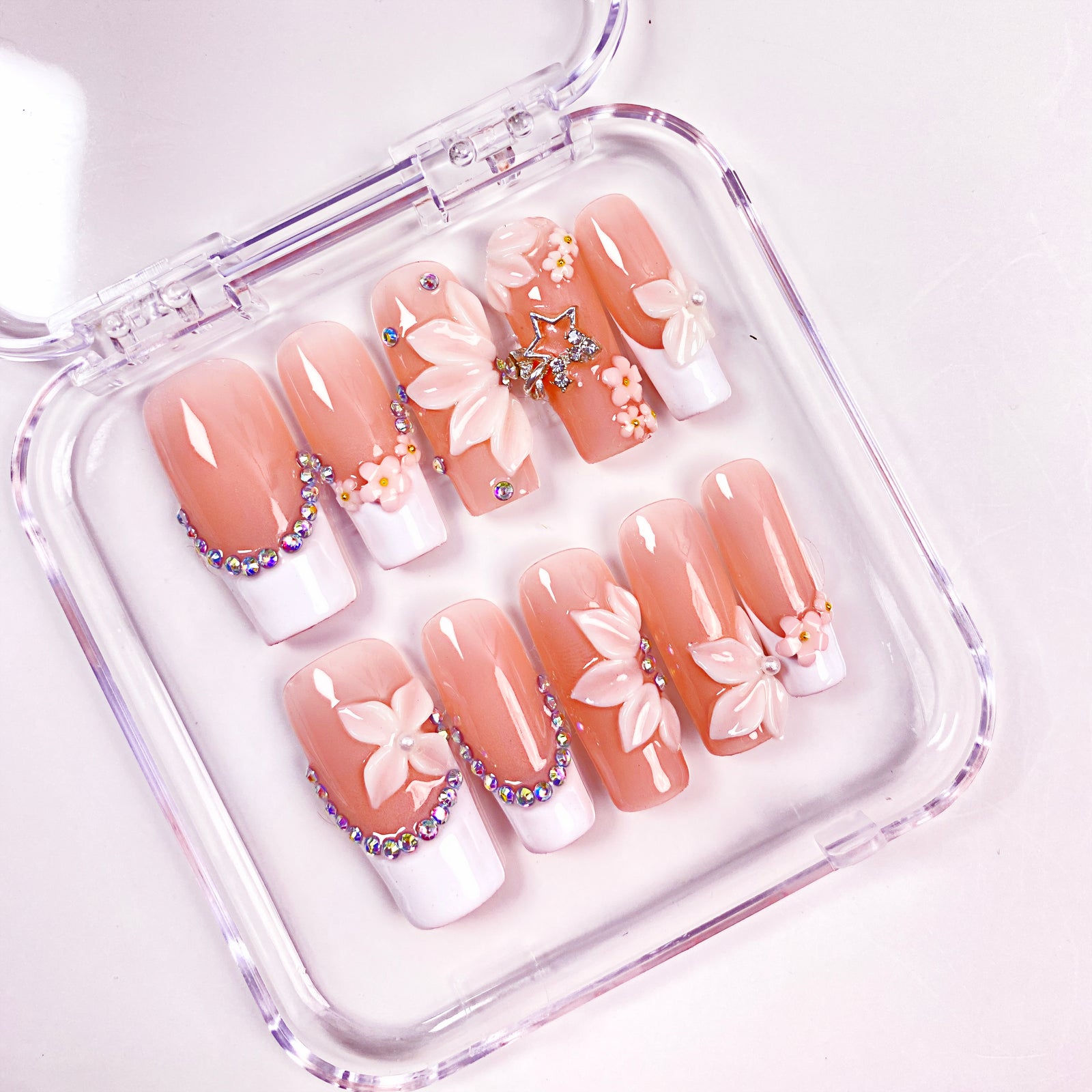 Experience timeless elegance with Crystal Petals press-on nails from Ersa Nails. Designed with a long square shape, these nails feature dimensional white flowers, French tips, and sparkling rhinestones. The crisp contrast of white and shimmer adds a delicate yet striking finish — ideal for bridal looks or chic everyday glam.