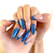 Shine effortlessly with these blue cat-eye press-on nails accented by elegant gold foil patterns. Handmade for a luxury nail look, these magnetic cat eye nails reflect light beautifully, adding sparkle and depth. Ideal for anyone looking for glitter press-on nails with a sophisticated, modern touch.