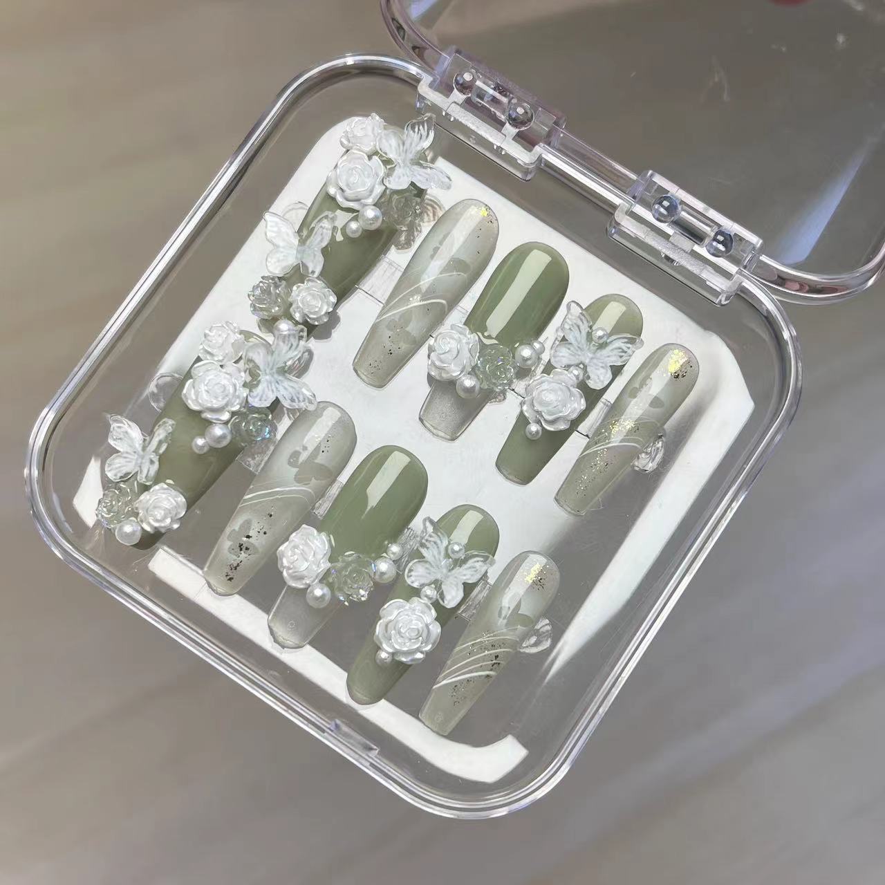 Emerald Bloom nails bring a fairytale forest to life. Lush green tones meet 3D flowers and delicate butterflies, creating an enchanting, nature-inspired design perfect for whimsical elegance.