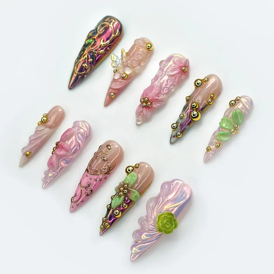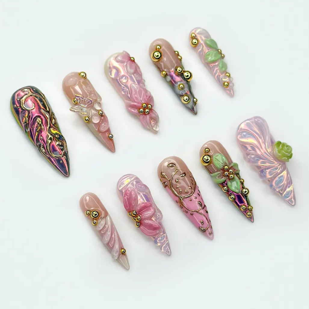 Experience dreamy beauty with our Enchanted Garden Fantasy Press On Nails. Each handmade long sculpted nail is adorned with 3D iridescent floral art in soft pink hues. Lightweight, reusable, and ultra-luxurious — a perfect choice for weddings, dates, or special occasions.