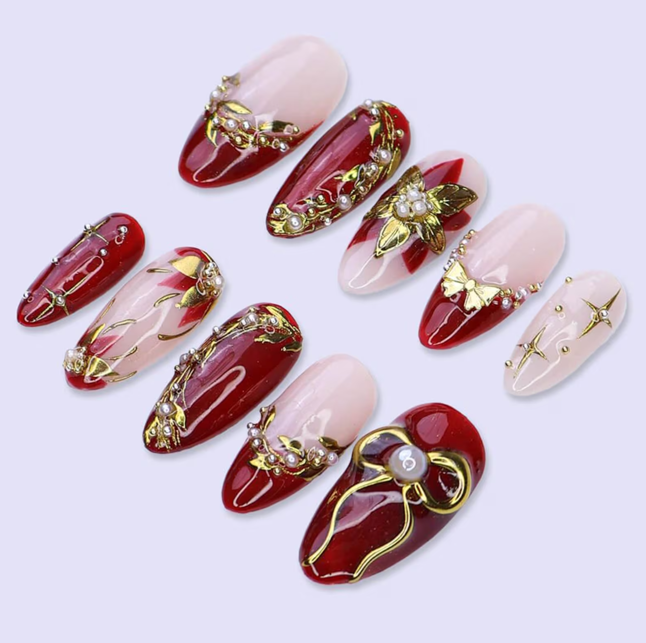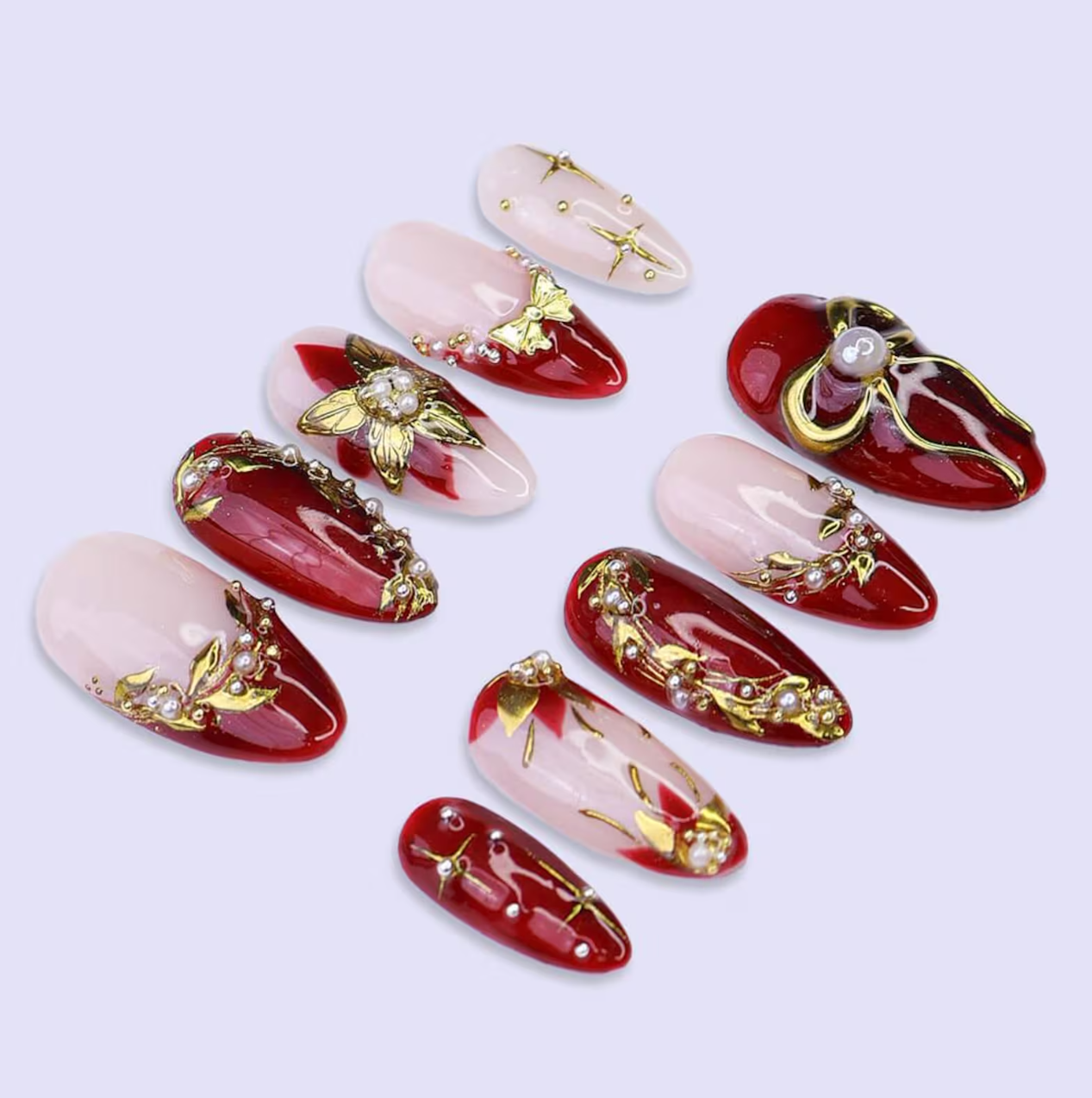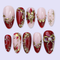 These Christmas press on nails showcase gold and red poinsettia designs, bringing a bold seasonal touch to your holiday manicure. The medium almond shape enhances elegance and comfort. Perfect for Christmas nail art trends, winter parties, and festive looks. Enjoy easy, reusable fake nails that deliver salon-quality holiday nails in minutes.