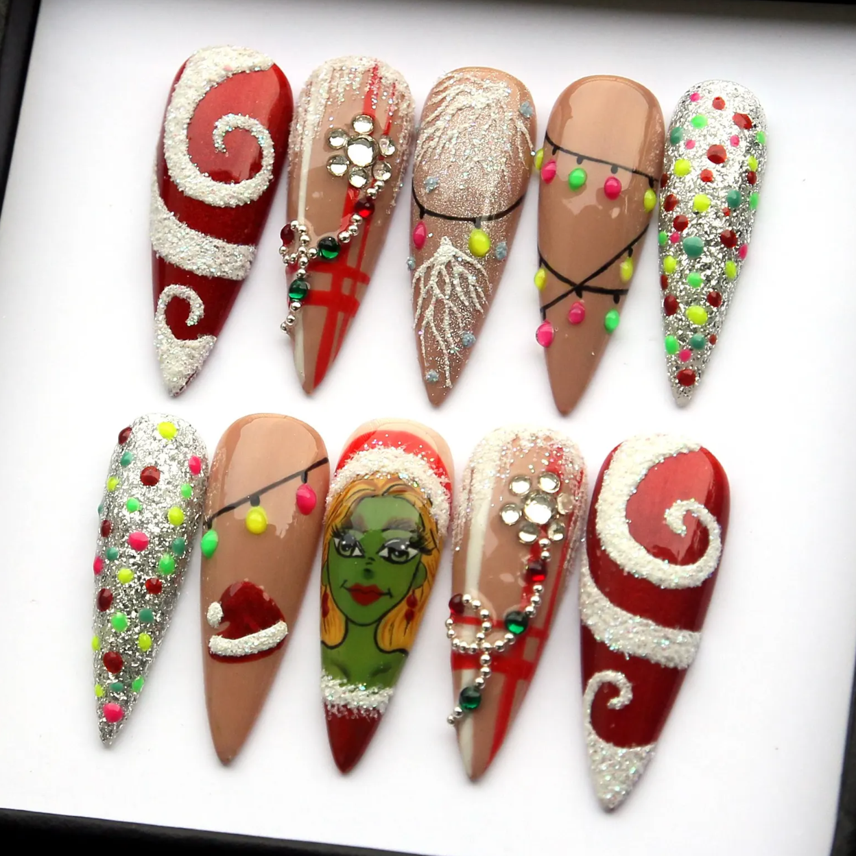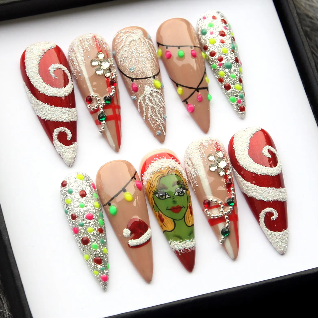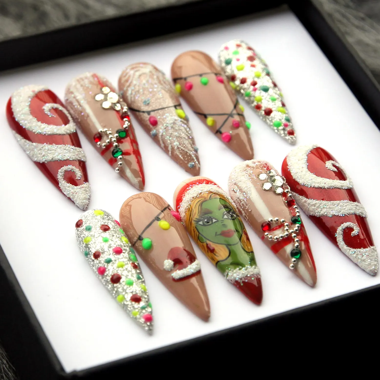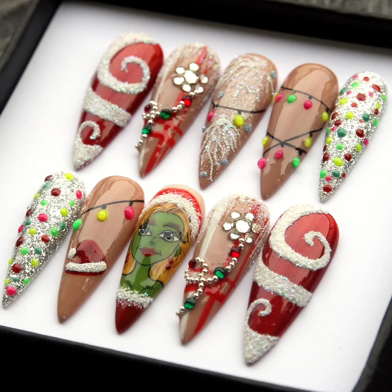Steal the show with Grinch Glam Press On Nails! This hand-painted stiletto Christmas nail set captures the fun, bold spirit of the season with green and red holiday designs. Perfect for Grinch fans, festive parties, or a unique Christmas manicure that’s both edgy and full of cheer!