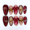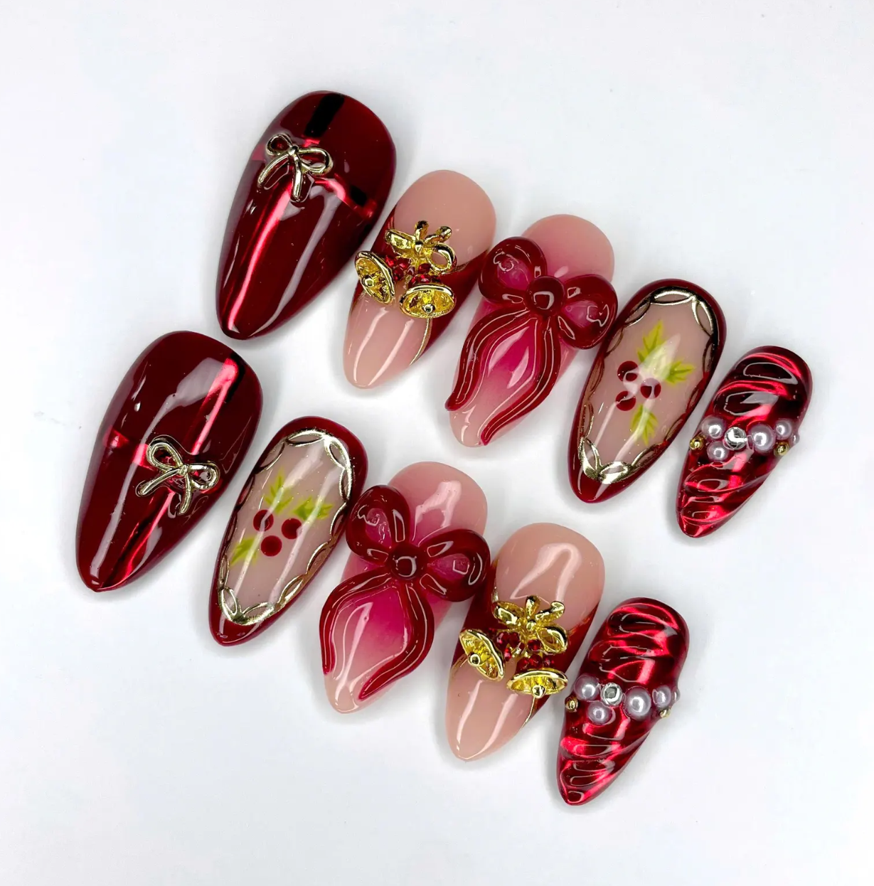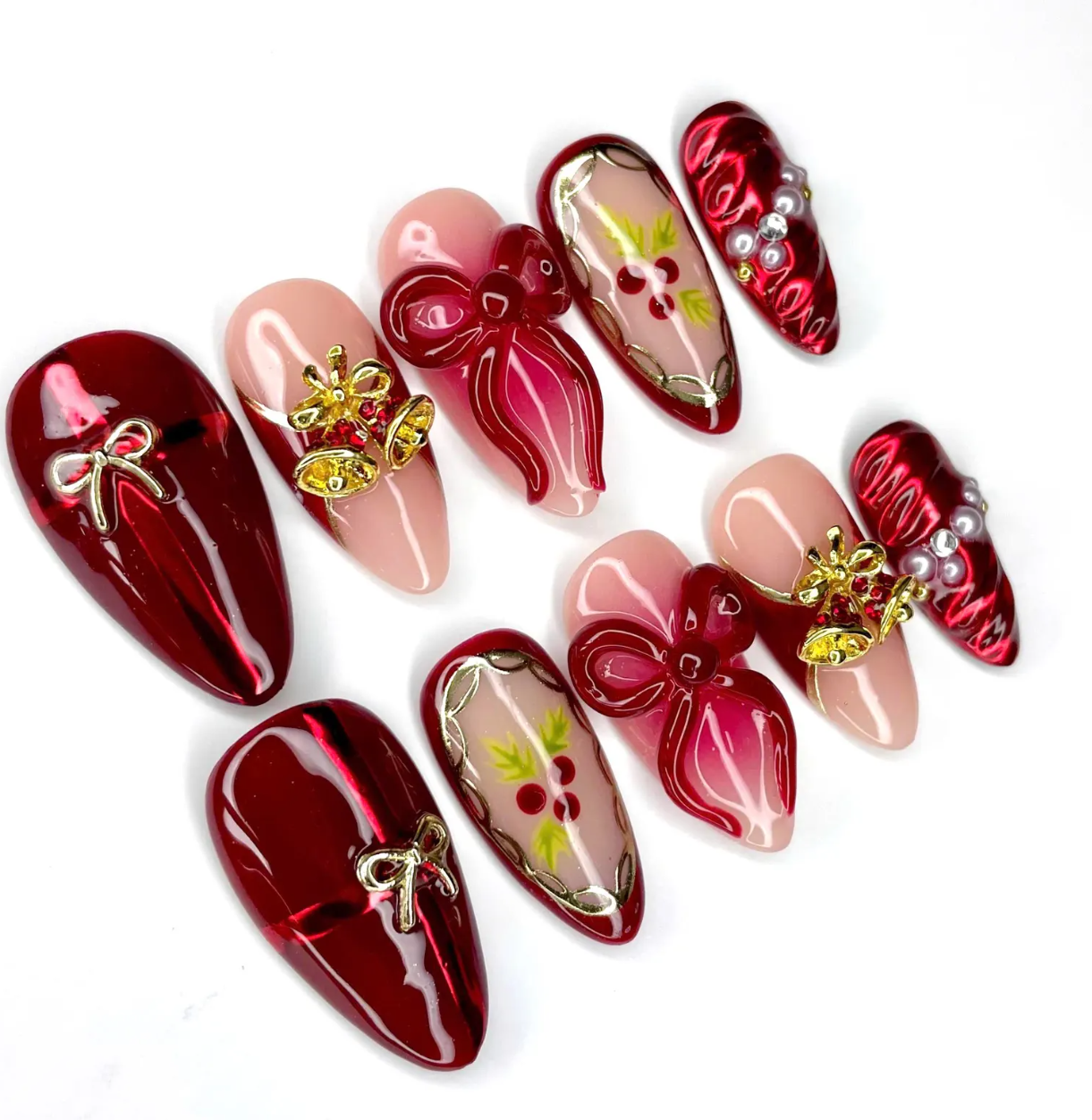 Holly Glam press-on nails feature rich red and gold tones with detailed snowflakes, bows, and Christmas tree patterns. Designed for a classic holiday look, this set is perfect for Christmas nails, holiday nail art, festive beauty, and photo-ready seasonal style. Easy to apply, long-lasting, and ideal for parties and gifts.